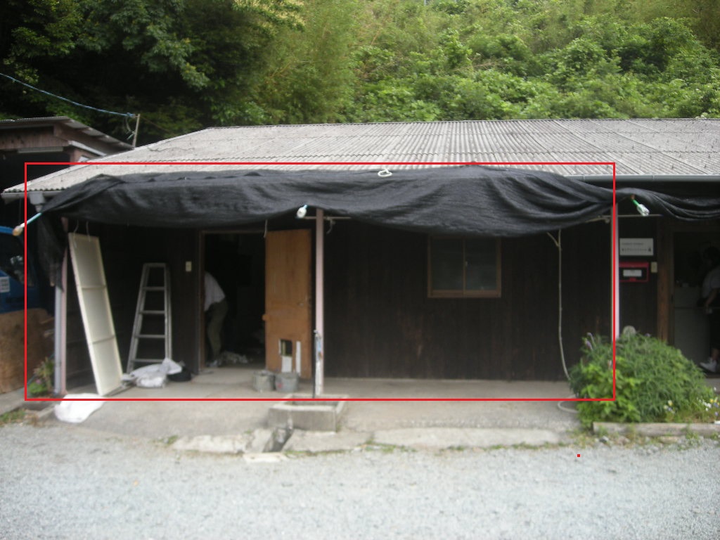 *建物の全容(山の中腹にあり、赤線で囲った左側の部分を新規の事務所に改装します