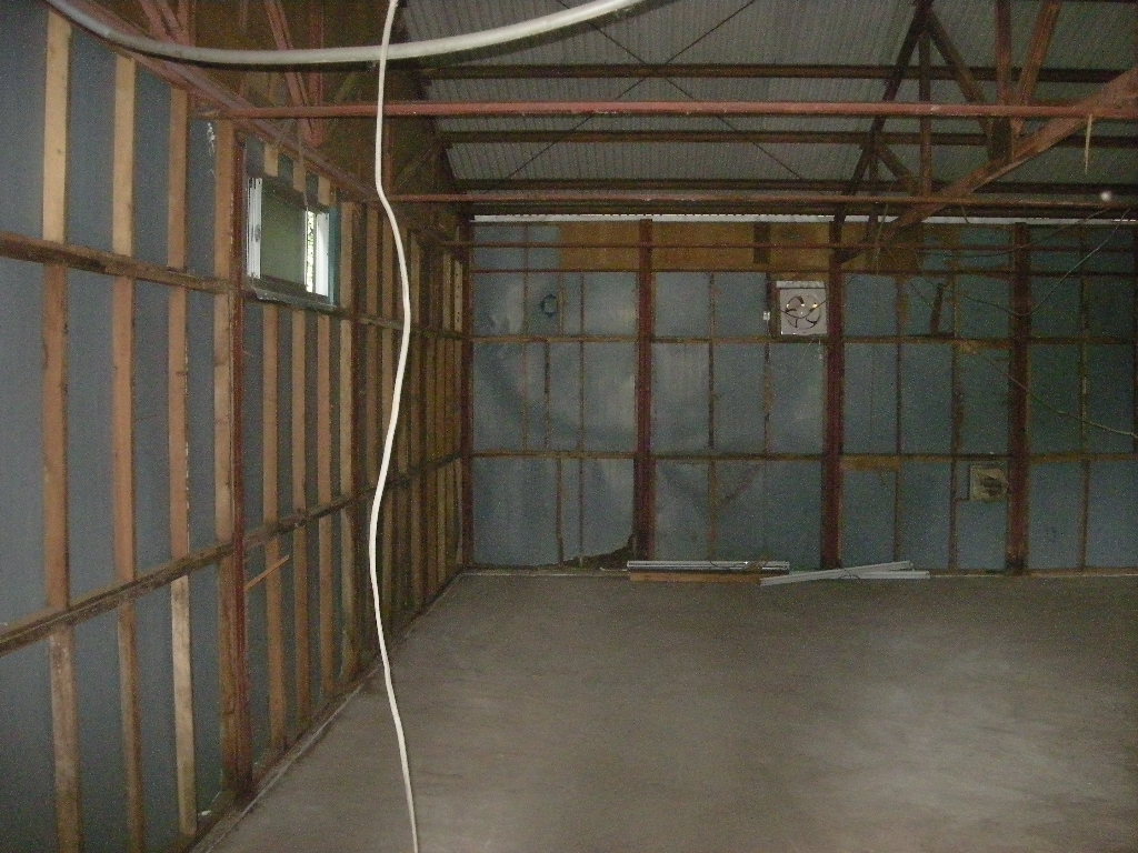 壁を造り、既存の右側の事務所との出入り口を2か所設け、エアコンを2台(動力用)取付け、