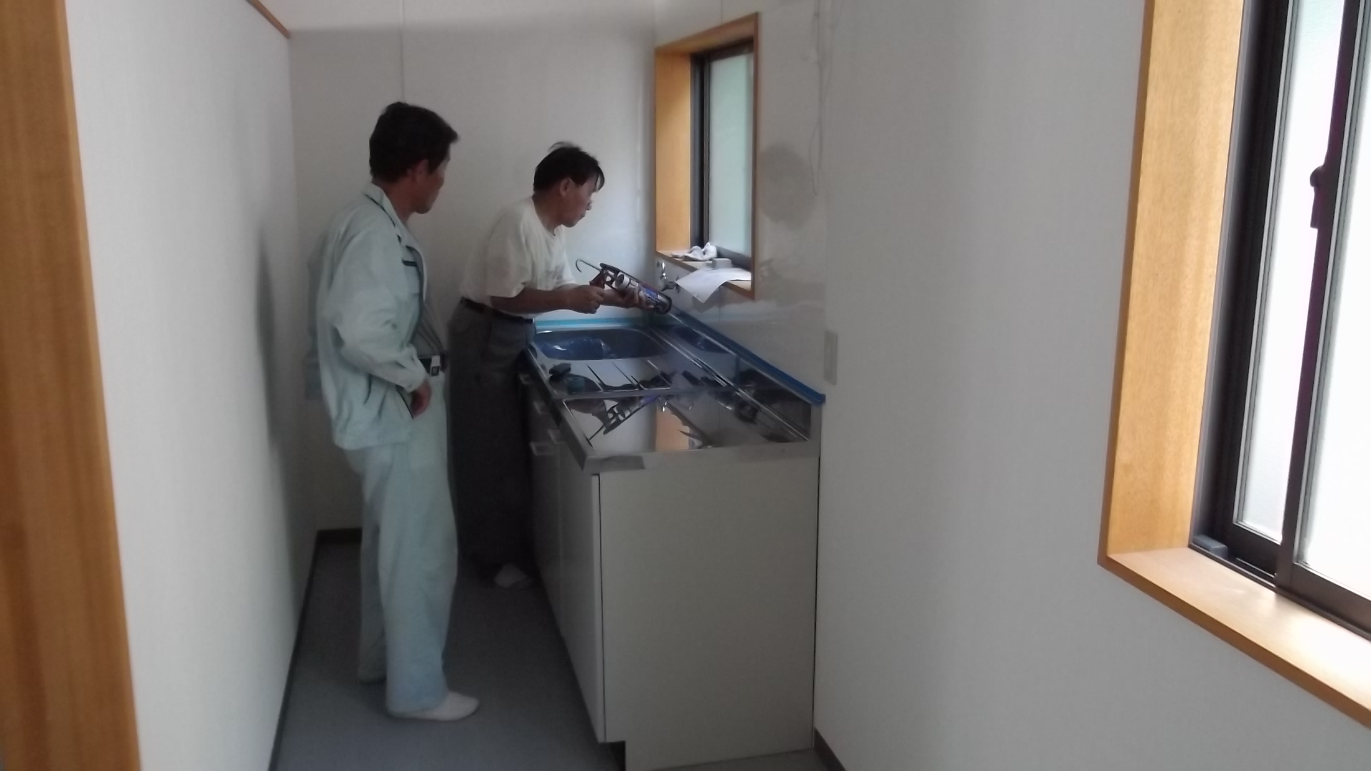 続いて流し台を据付け、仕上げのコーキングを打ちます!!