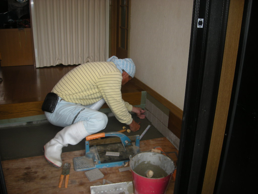 土間部分も、ご覧の様にタイルを張りました(新規のタイルは施主さんの希望で色を変えました)!!