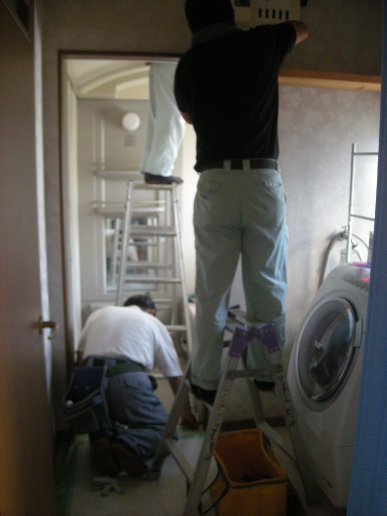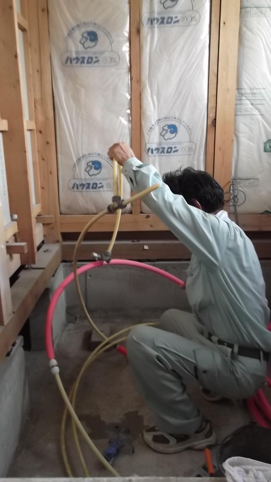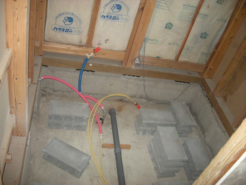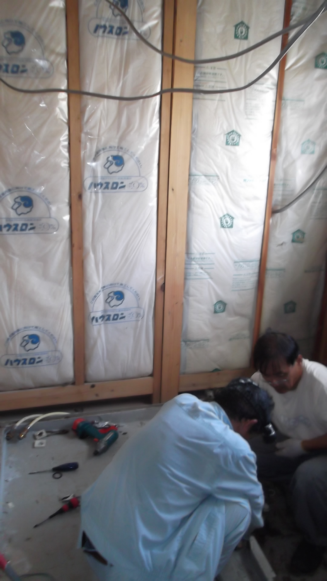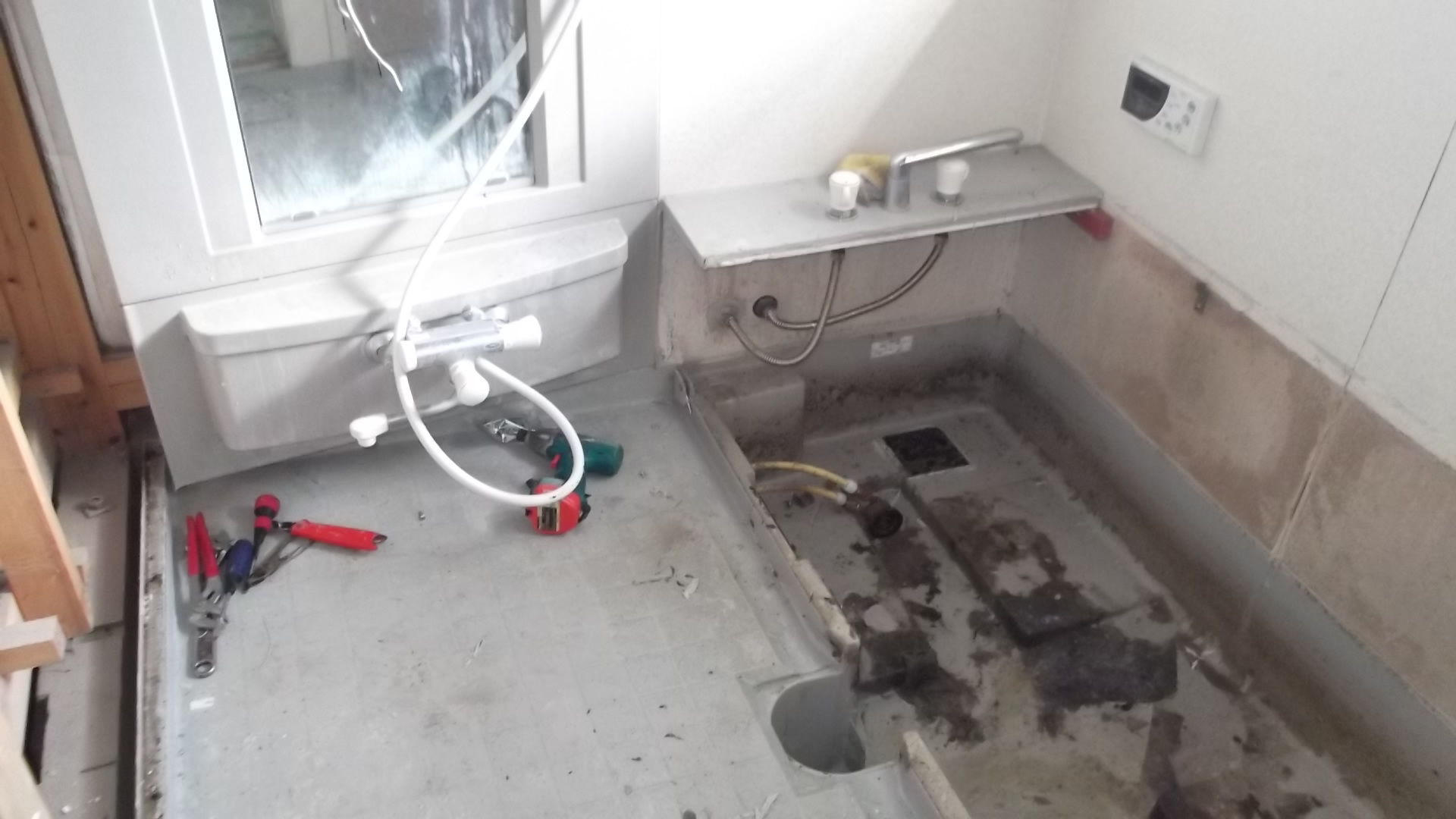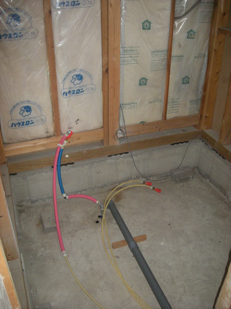 解体作業が終わると設備屋さんが新規のシステムバス用の給水,給湯、追い炊き用の