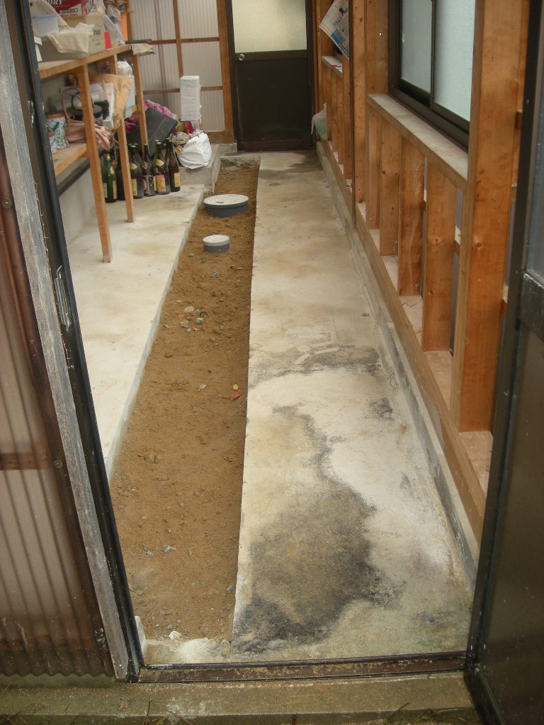 ④、の部分は倉庫の中になるため土間のコンクリートにカッターを入れハツリ、ご覧の様に