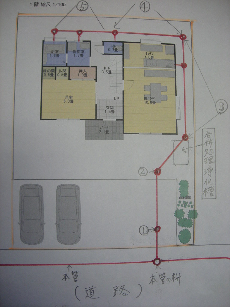 ここで問題になったのが、通常敷地内に、かならずあるはずの①の枡(現在は合併処理浄化槽のため