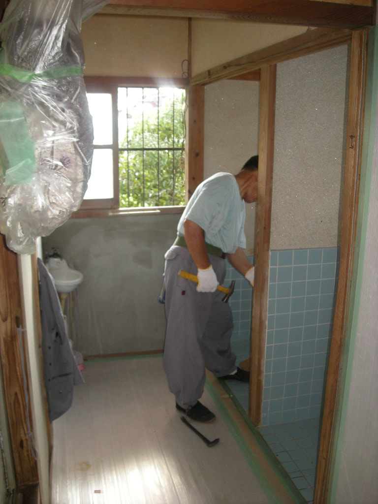 タイル部分も撤去し、壁廻りにクロス下地となるベニヤを施工して行きます!!