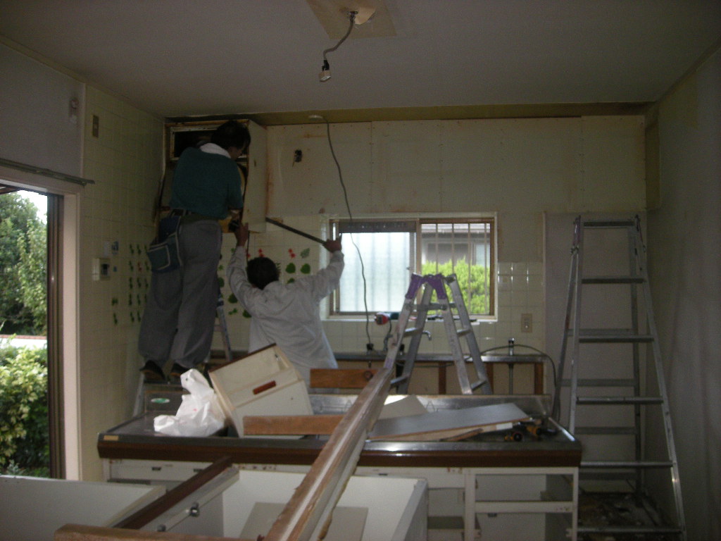キッチンの撤去後、吊戸棚、レンジフードと順次解体、撤去して行く!!