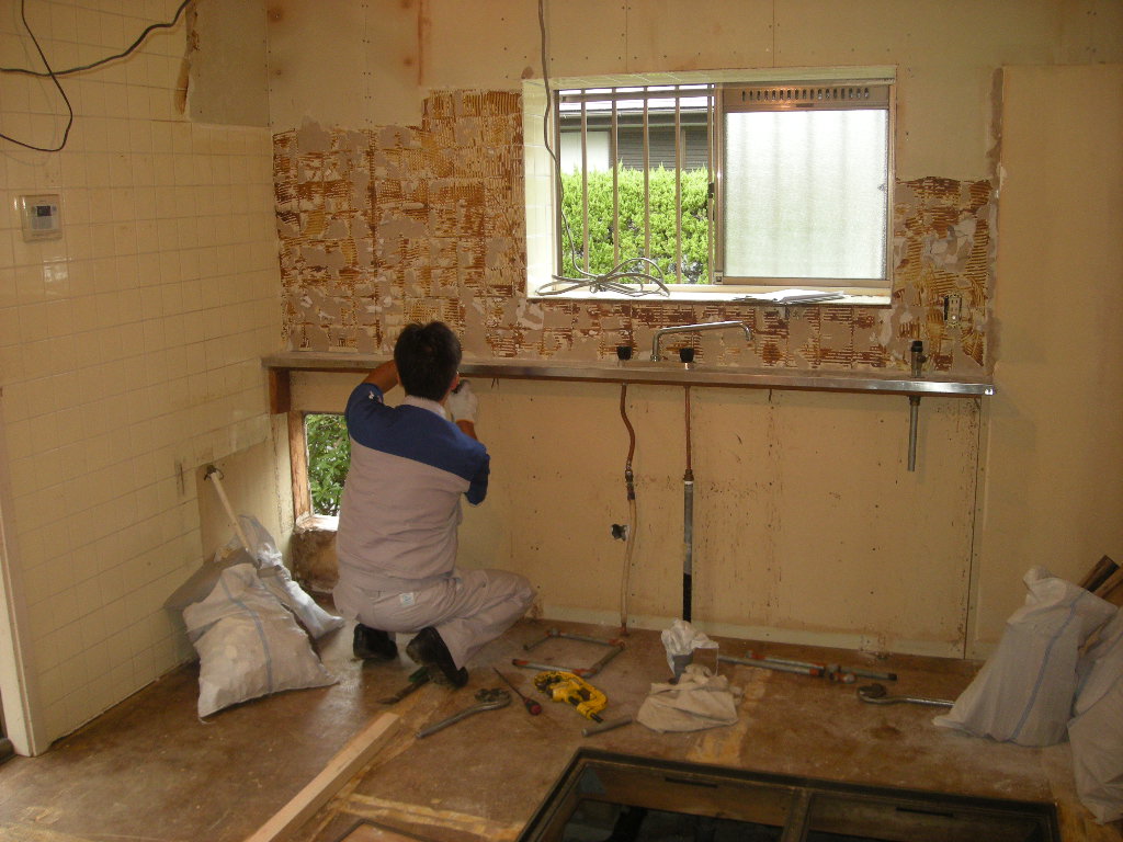 後はキッチンパネルを張り新規の流し台の据付け、新規の台所水栓の取付け、内装工事等を
