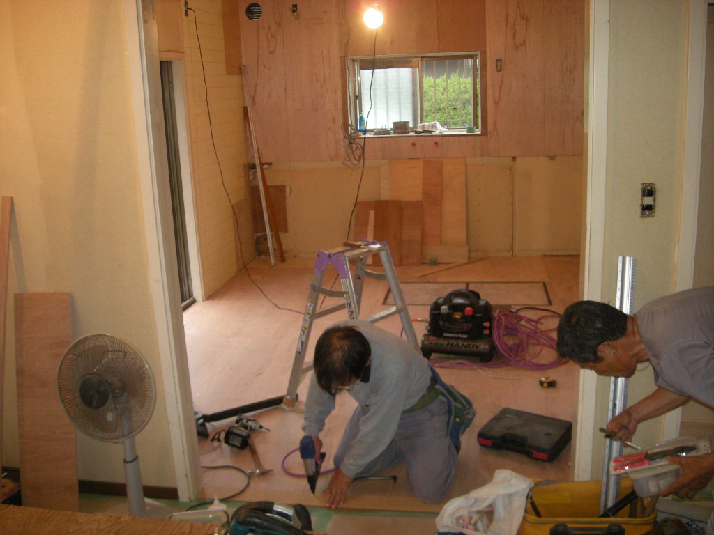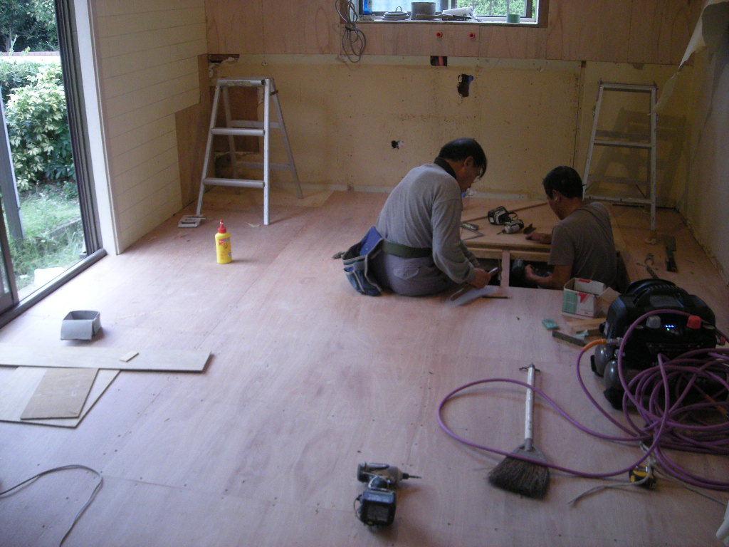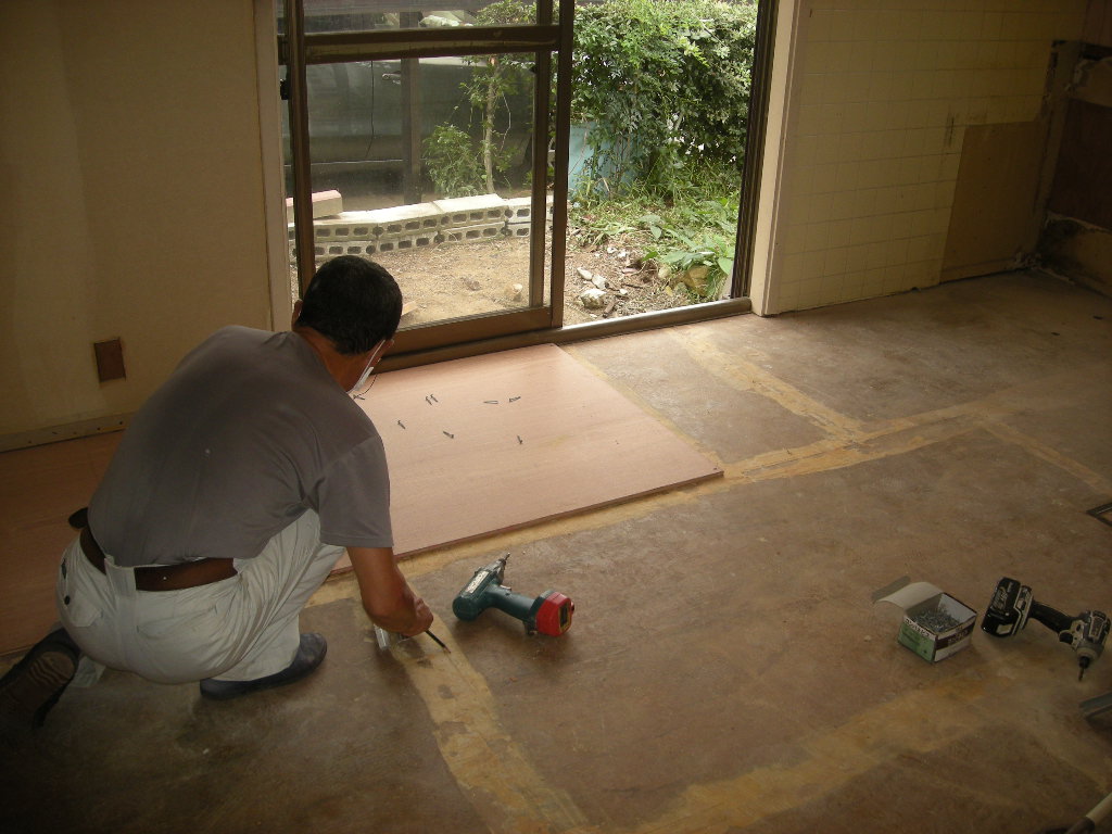 ・床がブカブカして状態が良くないので、既存のCFを撤去後、コンパネを張り新規のCFを施工。