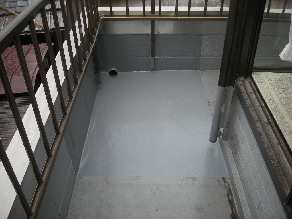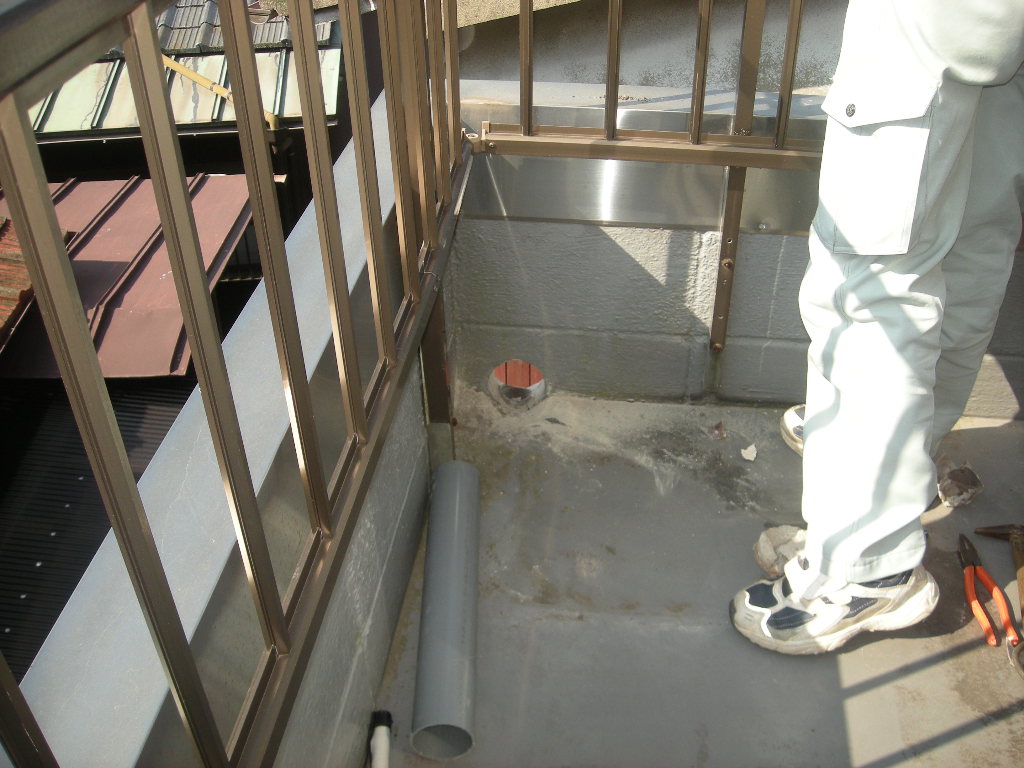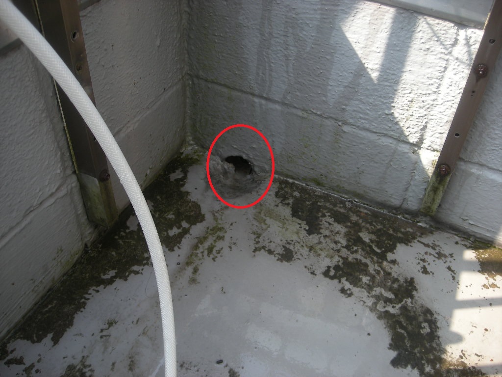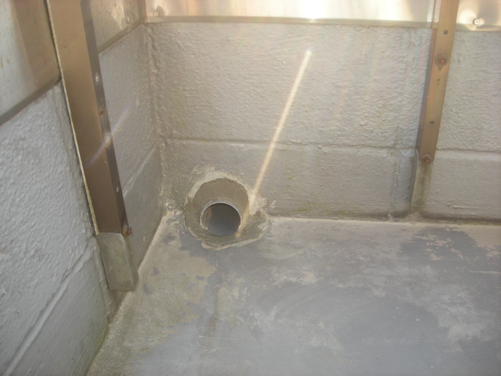 バルコニーの現状(排水管がバルコニー側の外に出ていなくて中に引っ込んでいるうえに