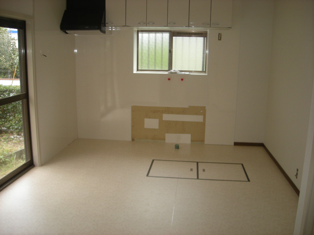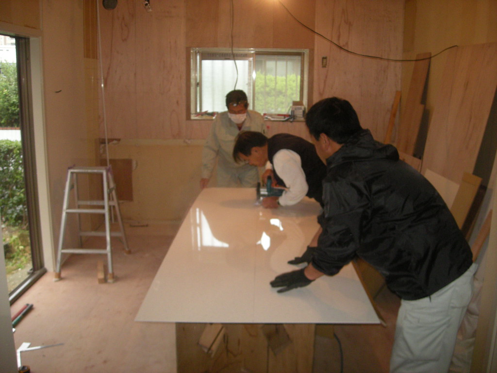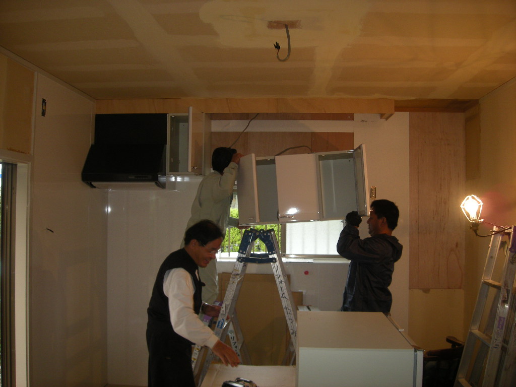 後は下の流し台部分を取付け、水栓金具の取付け、ガスの配管工事、若干の電気工事を