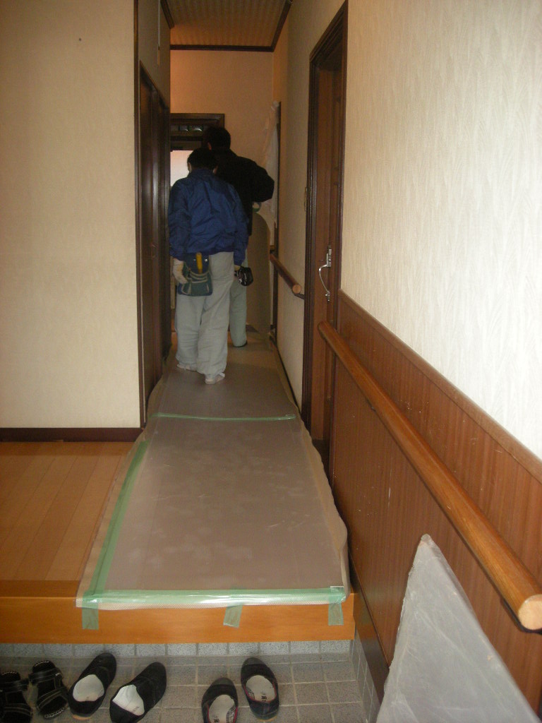 現場に到着すると、いつもの様に玄関からトイレまでの通路に養生をします!!