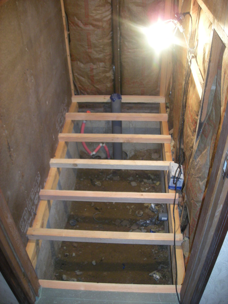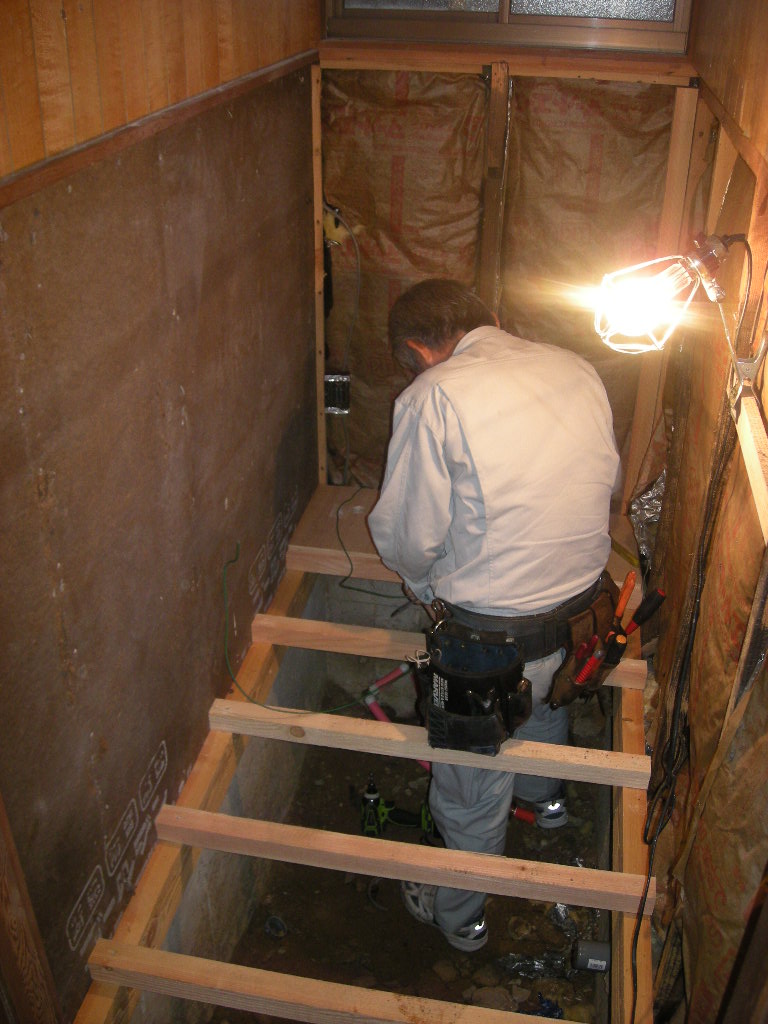 設備屋さんが排水管の移設と給水管の整備を行った後、、床の座を組みました!!
