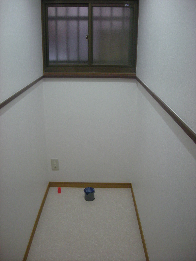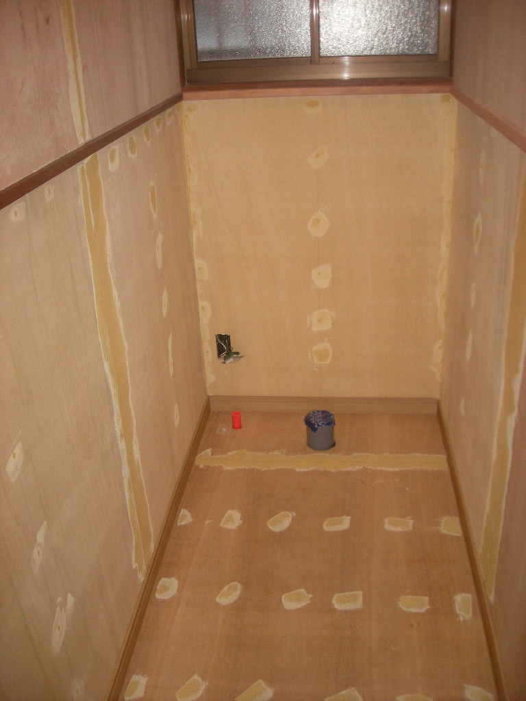 天井と壁の上部には既存の上からベニヤを、腰下部分は備品や手摺りが付くため