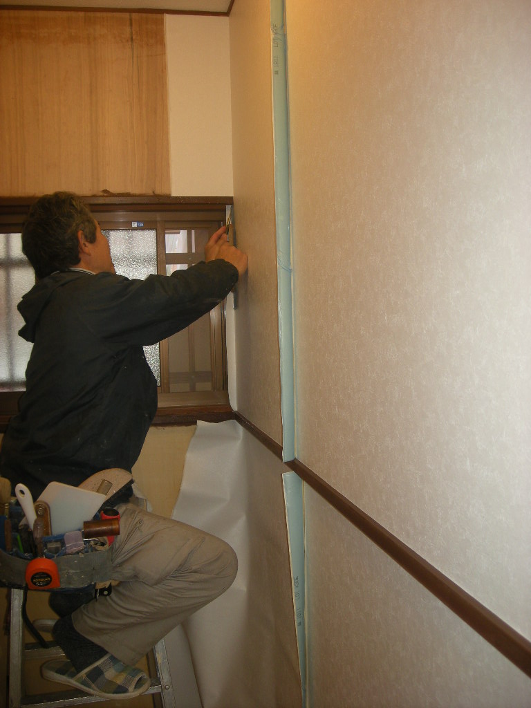 つづいてクロス屋さんが、天井と壁廻りにはクロスを床にはCFを張って行きます!!