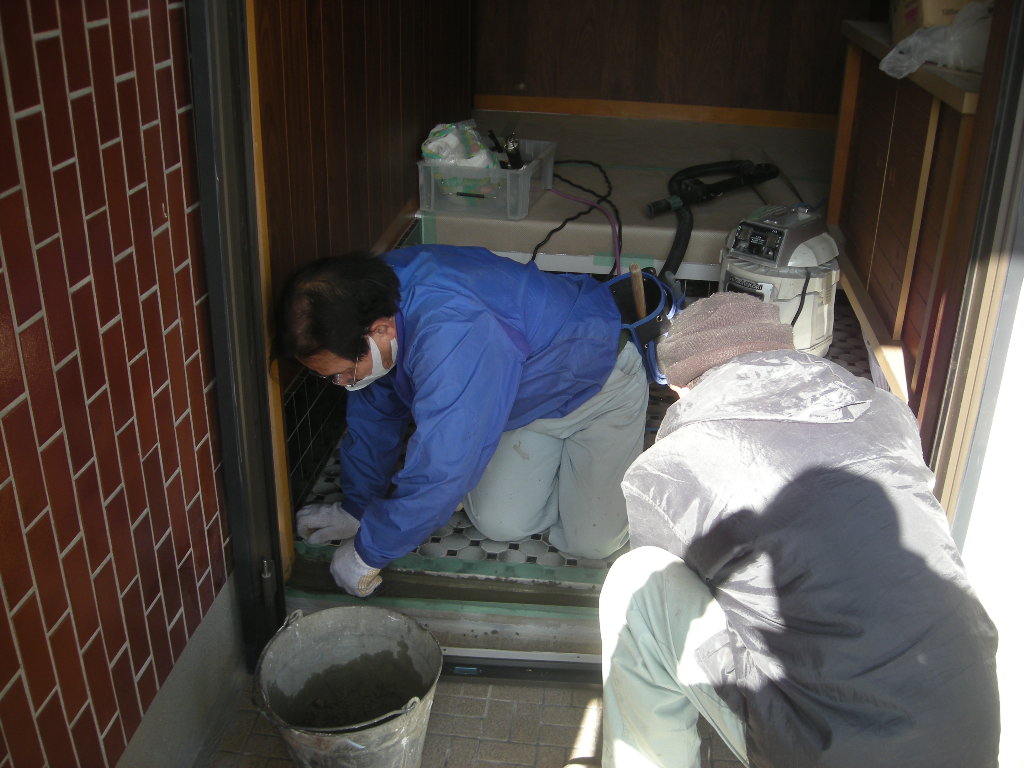 枠をしっかりビスで固定し、カットした土間の下部の隙間にモルタルを入れます!!