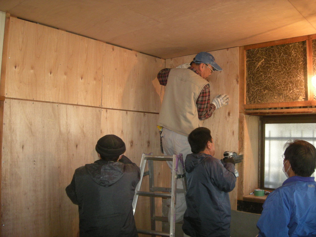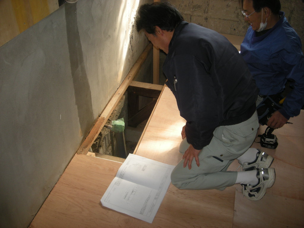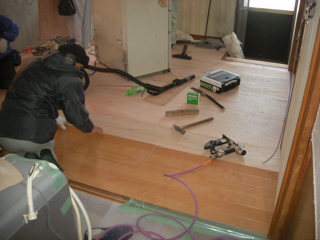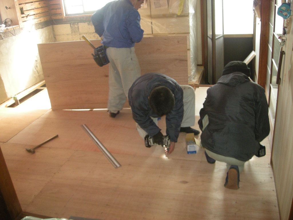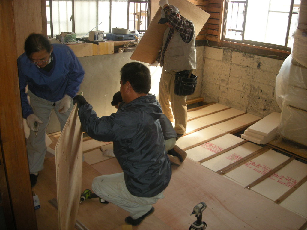 既存床材を撤去後、根太の悪い部分を補強し根太の間に断熱材(カネライト40)を入れ、下地の捨て貼りコンパネを施工して行きます!!