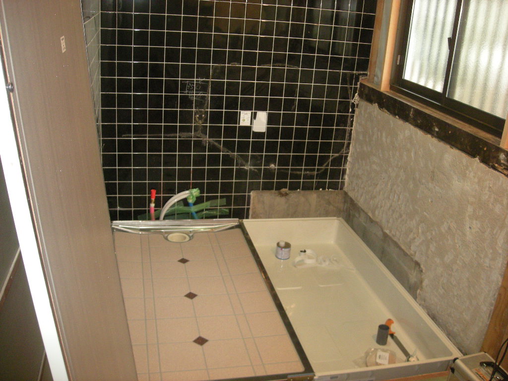 下の架台を設置し、浴槽の受け盤と洗い場の据付けから始めます!!