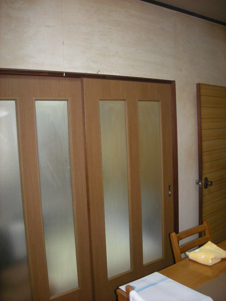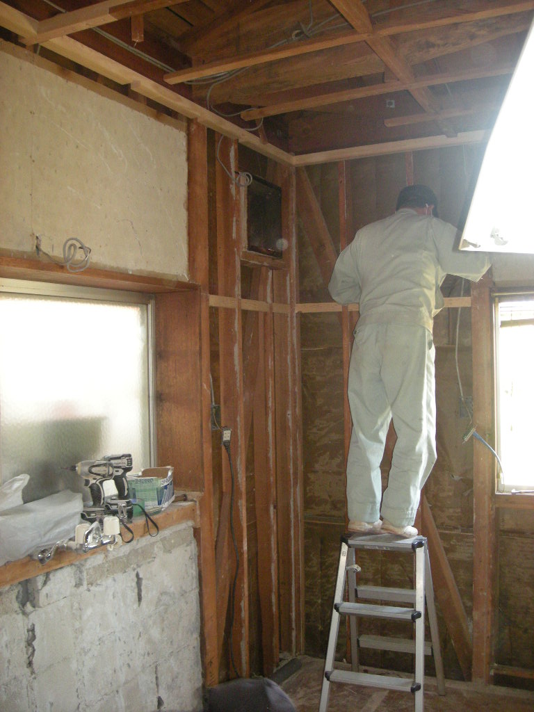 通常なら、しっくい壁の場合は、その上に直接クロスを張ることが出来るのですが、冷蔵庫や食器棚を移動して見ると、その部分の壁がカビ等で色が変色していたりしていて状態が悪いので結局全部解体、撤去し下地から造り直すことにしました。