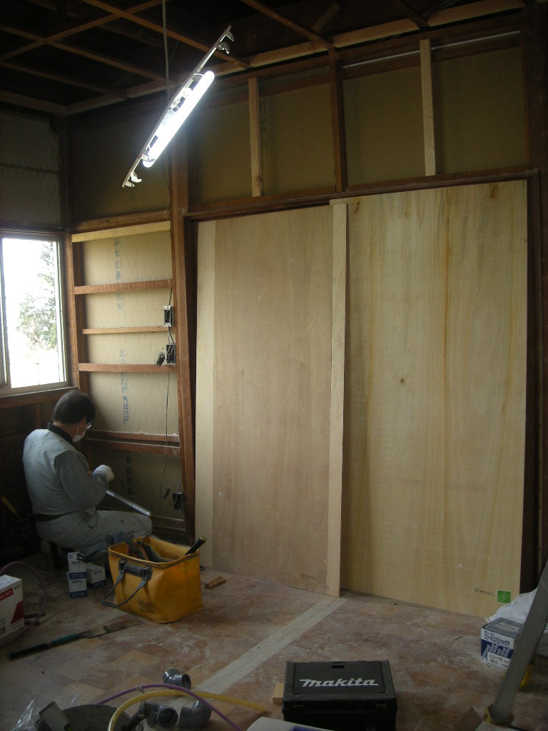 壁廻り(既存のしっくい壁と下地のボードを解体,撤去し下地ベニヤを施工後、クロス仕上げにします)!!