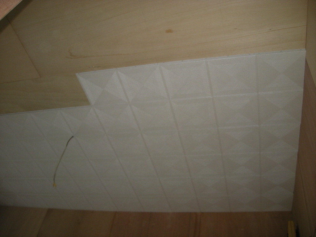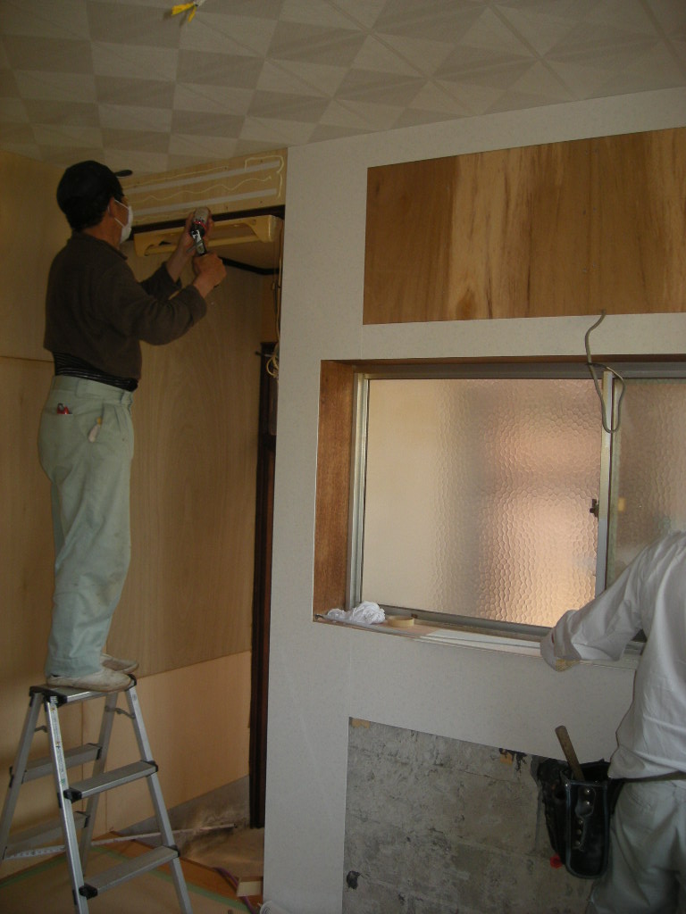 天井は下地ベニヤを施工後、新規の準不燃天井材(テックス)を張って行きます!!