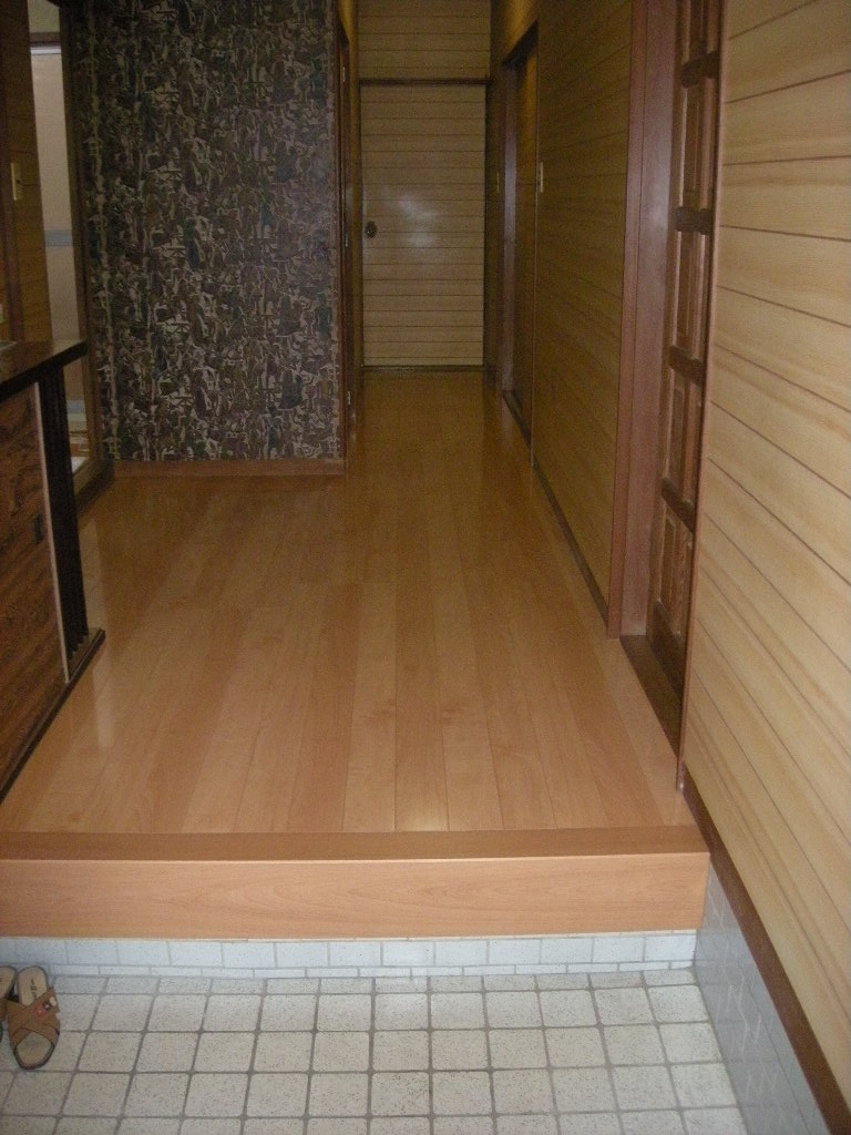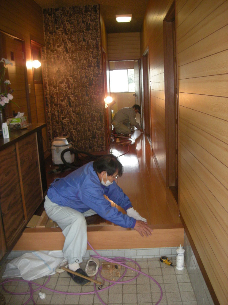 廊下の床がブカブカするので、既存の上から新規のフロア材を施工します。