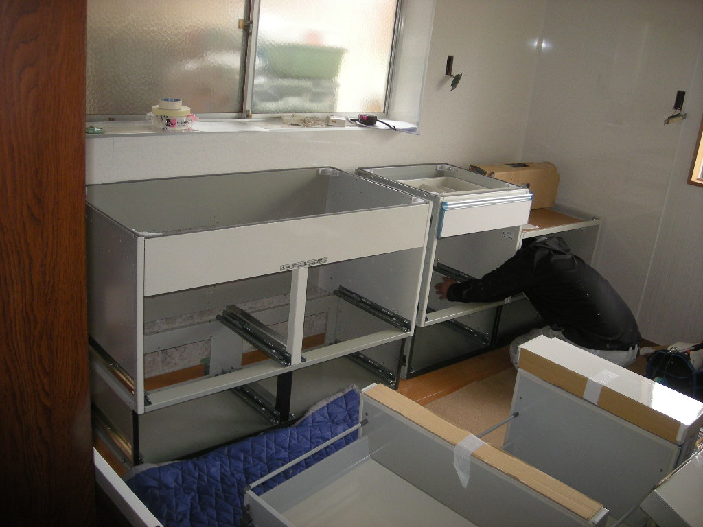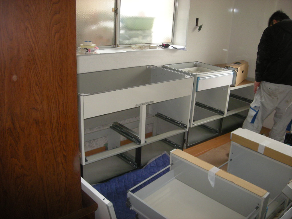 *前回までに、台所のそれぞれの下地づくりから天井材の施工、床の張替え、キッチンパネルの施工、内装工事まで完了し次はシステムキッチンの組立へと進みます。