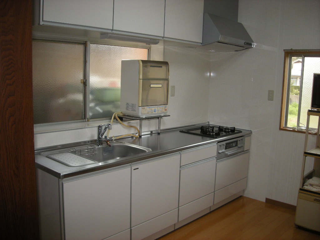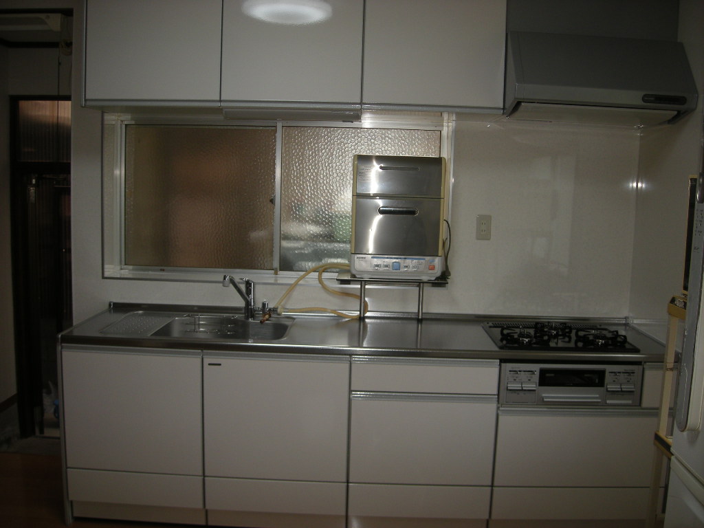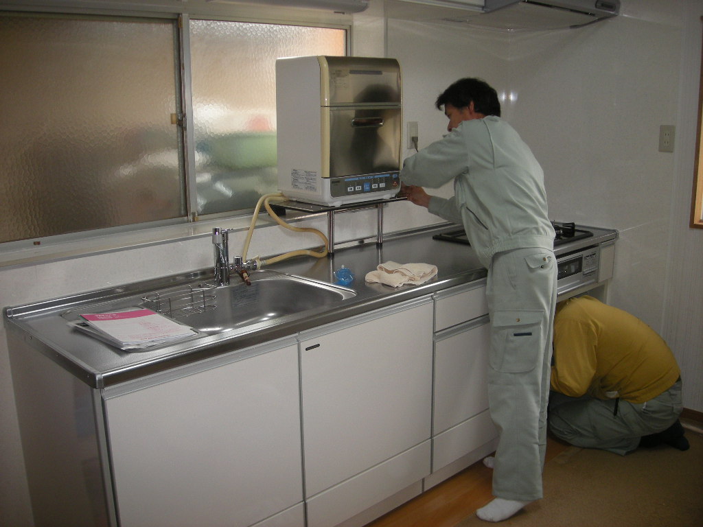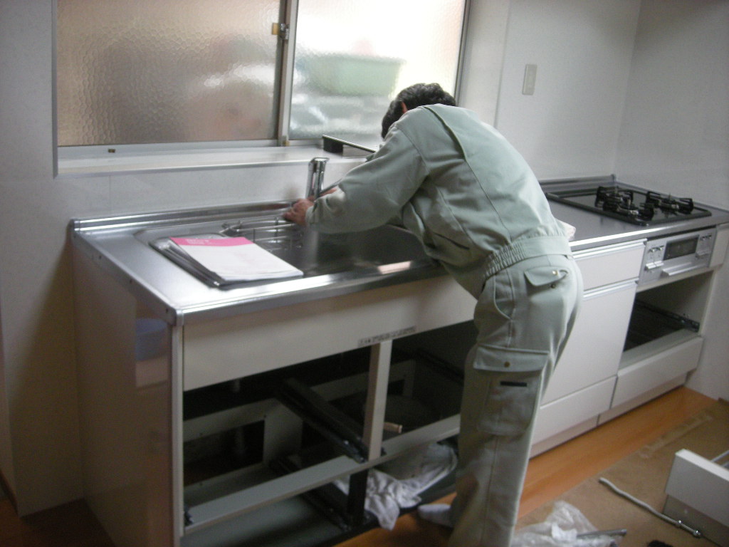 メーカーのタカラさんの職人によるキッチン部分と換気扇、吊戸棚の組立が終わったら今度は設備屋さんが食洗機の分岐の付いた水栓の取付けをします!!