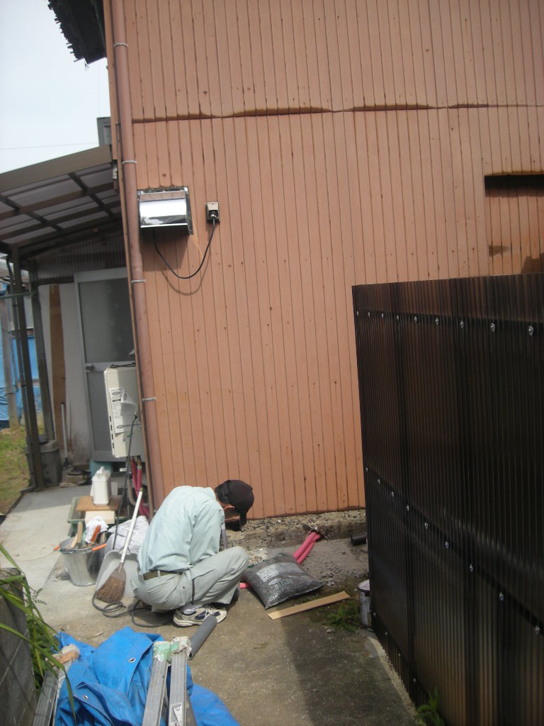 外の土台部分にも穴を明け、配管を入れ込みます!!