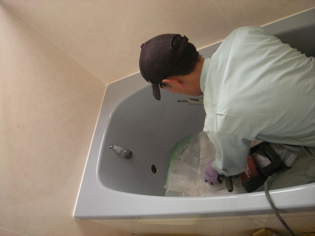 次は設備屋さんが浴槽に追い炊き用の循環金具を取付けるための穴を明けます!!