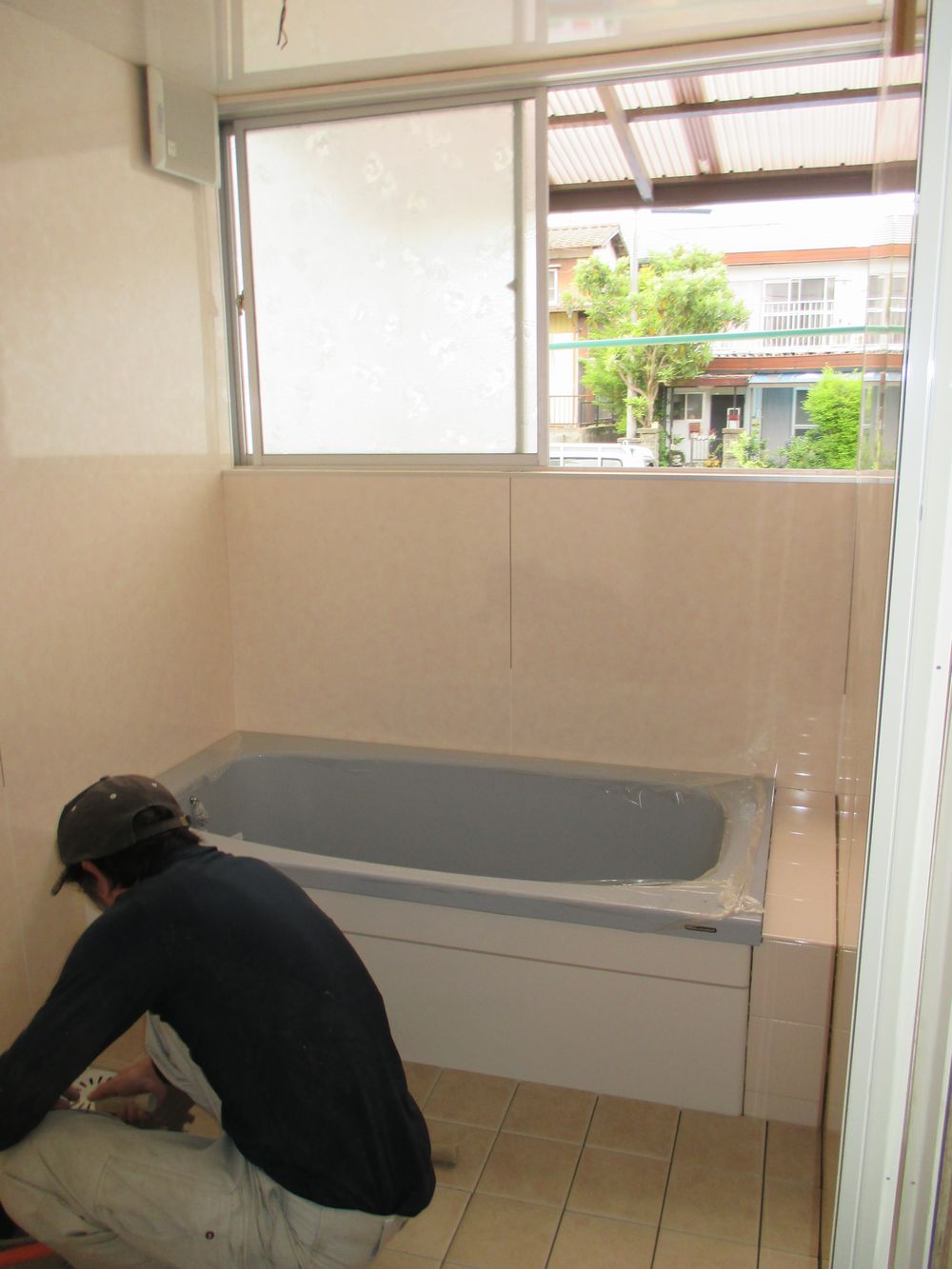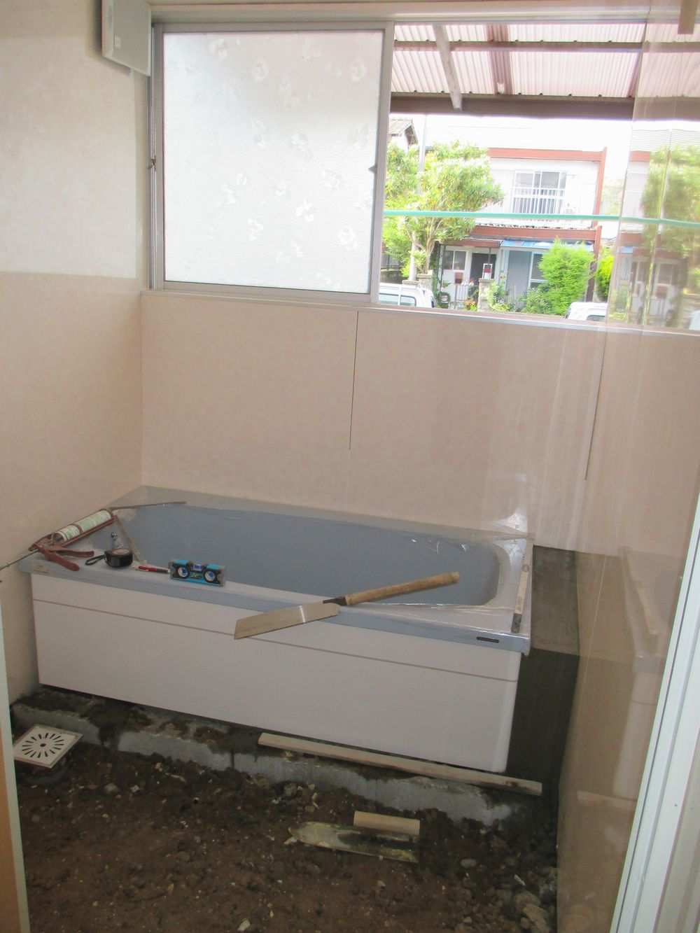 左官さんが浴槽を据付け、洗い場の下地づくりをします!!