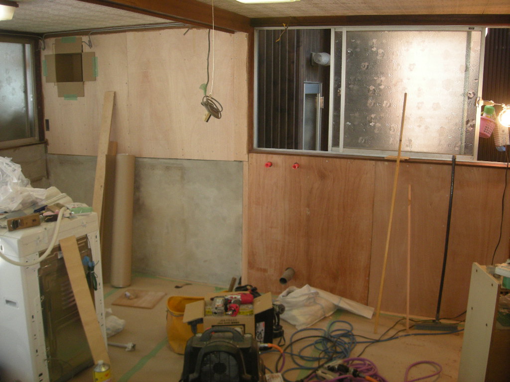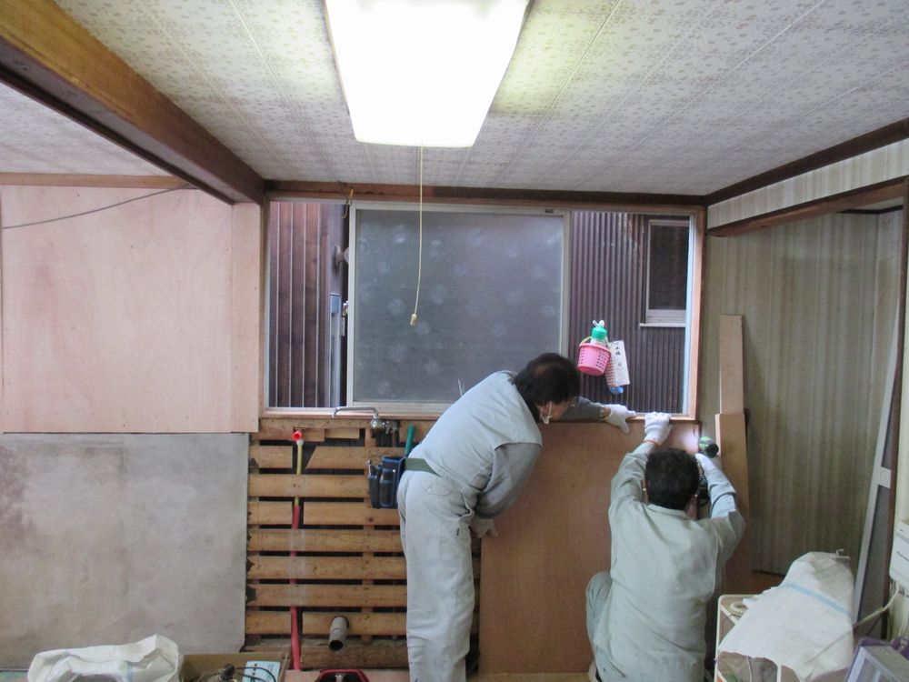 床にはCF下地のコンパネを張り、つづいてキッチンパネルを張る部分にも下地となるコンパネを施工して行きます!!