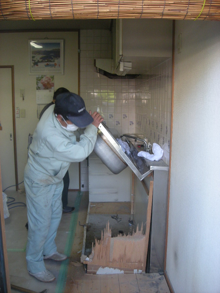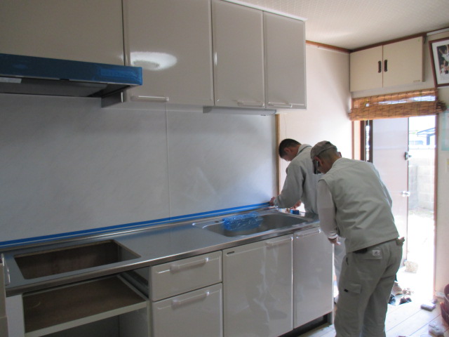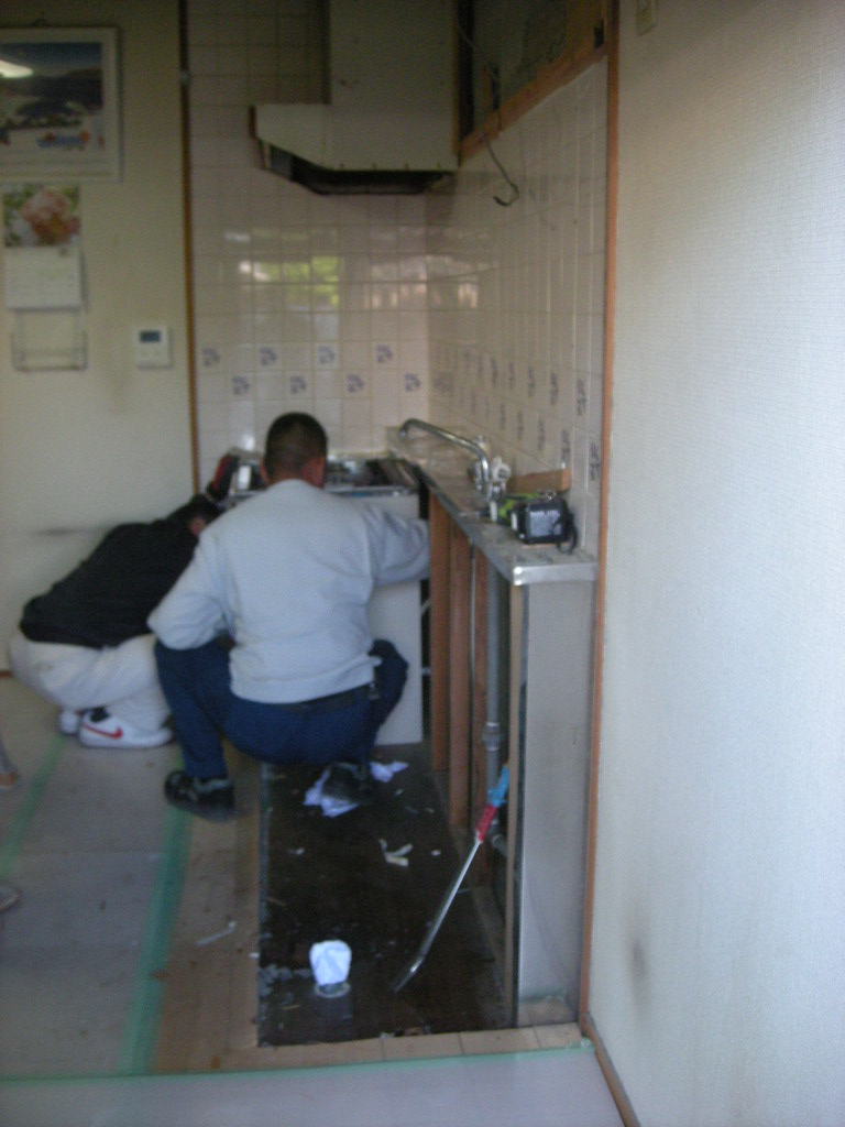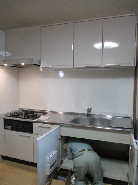 つづいて設備屋さんが新規の台所水栓を取付け、接続ます!!
