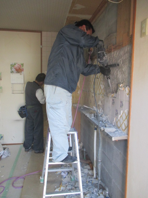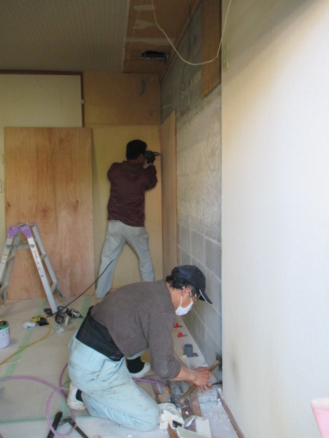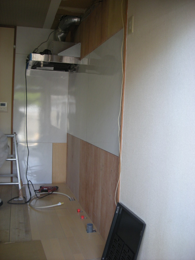 タイルを撤去後、パネル下地となるコンパネを施工し、新規のシステムキッチン用の