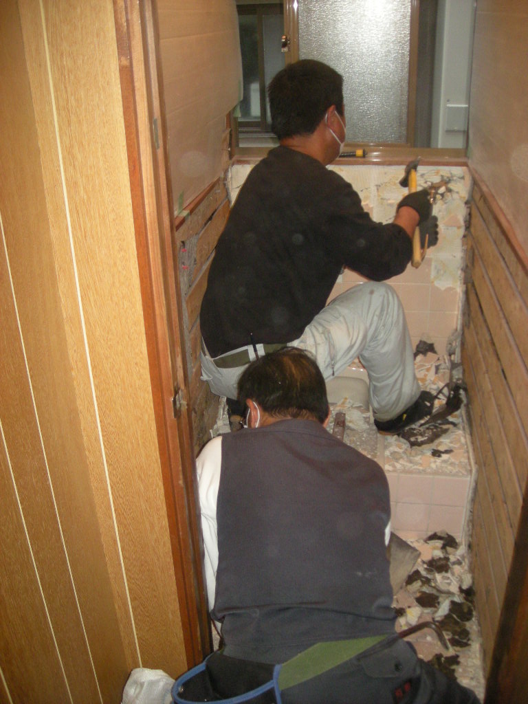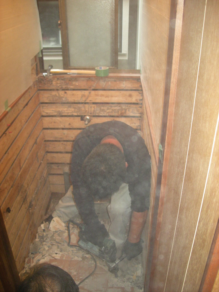 つづいて床の土間タイルをピックで斫り、撤去して行きます!!