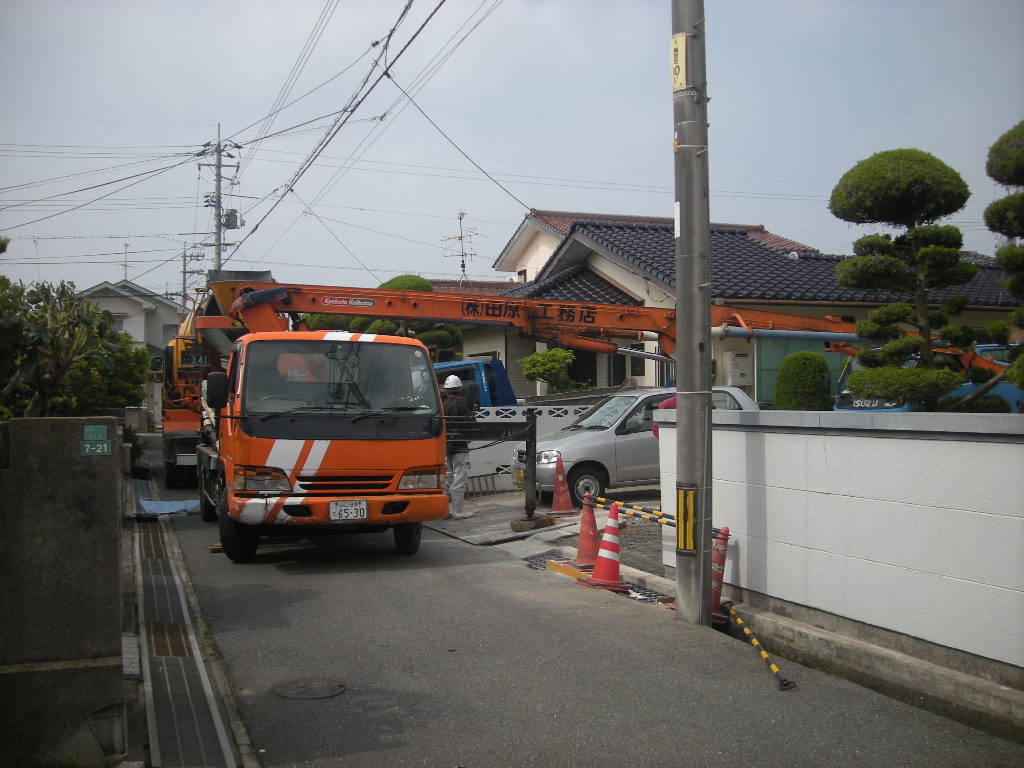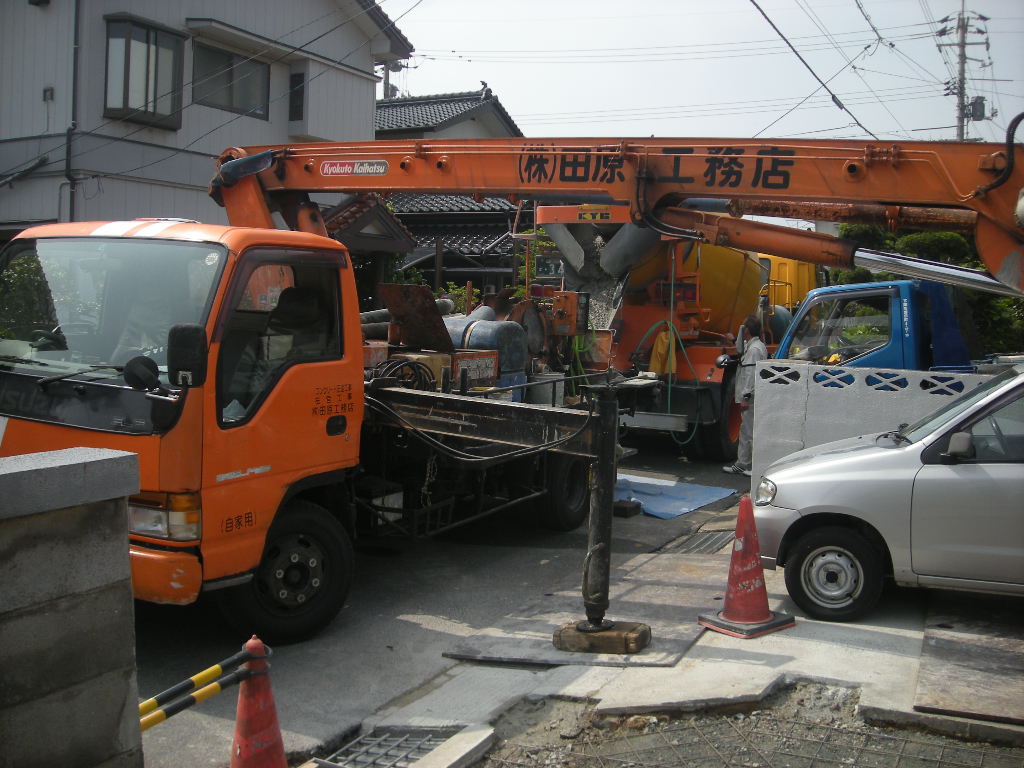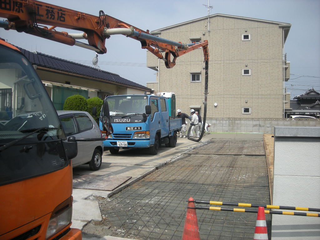 今回は生コン打設範囲が広いと言うことと、生コン車が奥まで入れないため、中間にポンプ車
