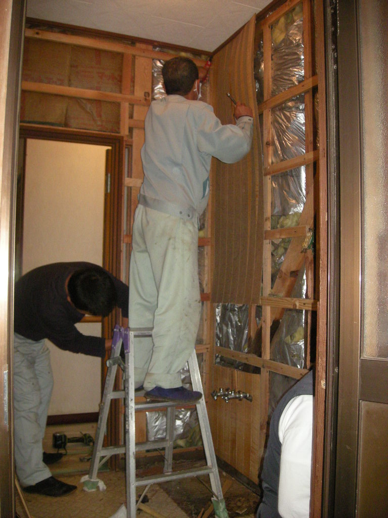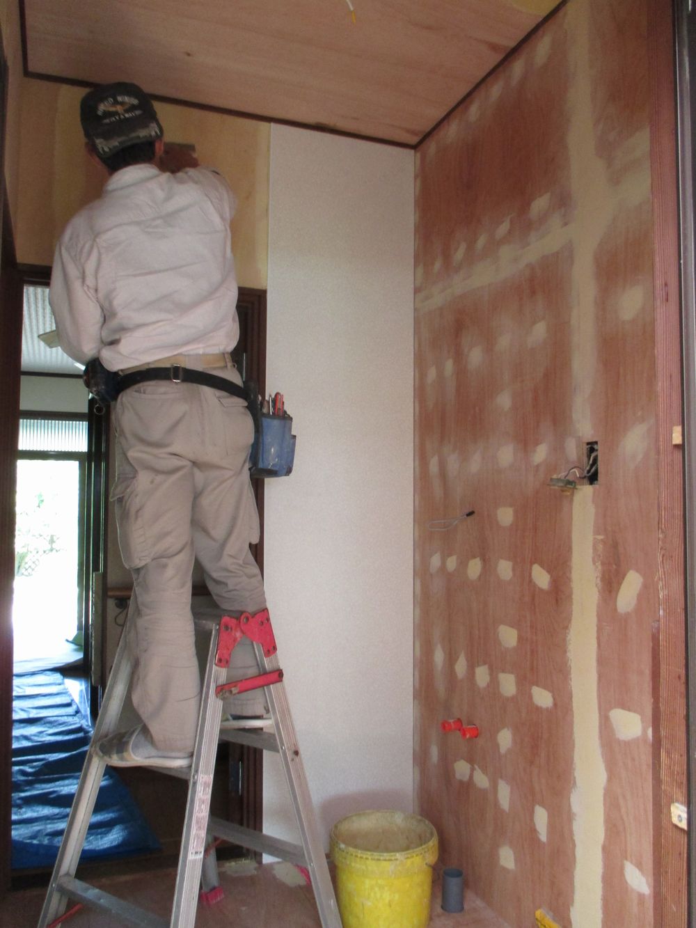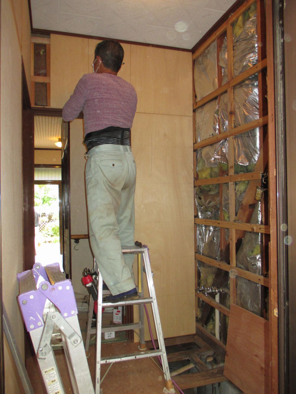 既存の壁板の撤去後、新規にクロス下地となるベニヤを張って行きます!!