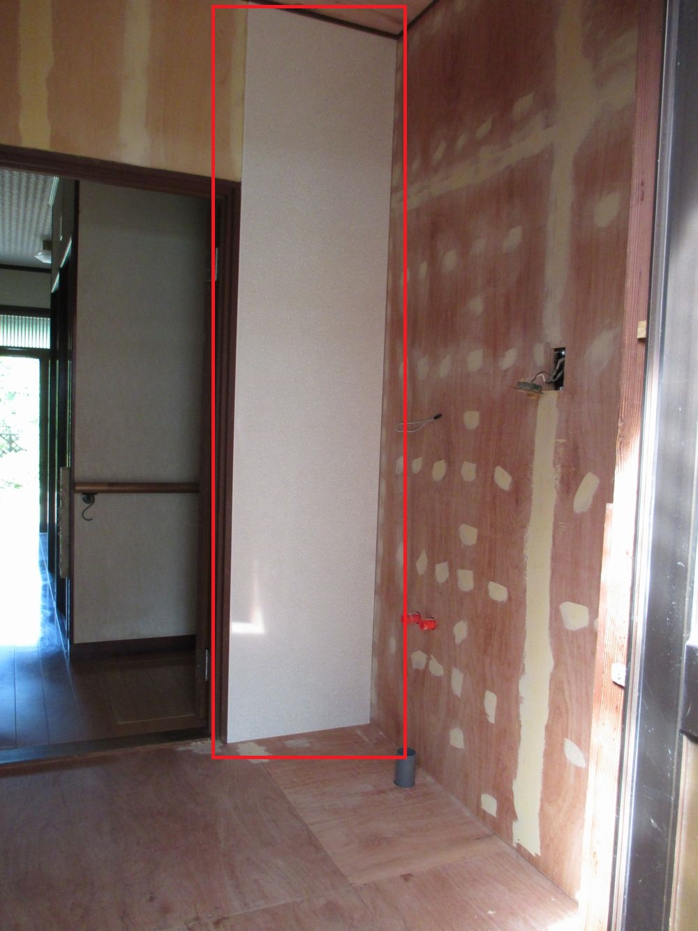 床もコンパネを張替え、化粧台を取付ける左側面(赤線で囲った部分)の壁に