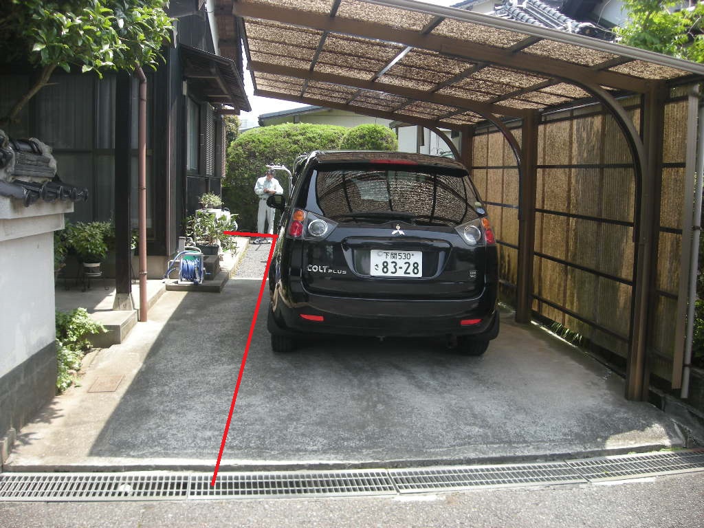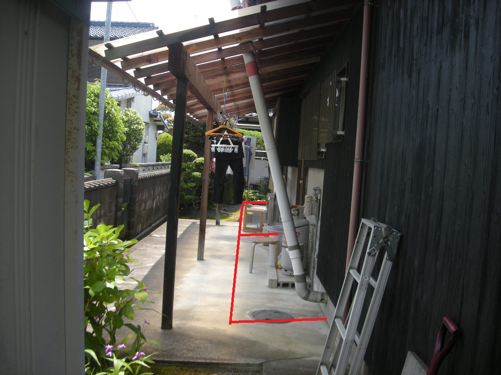 裏のトイレまでも赤線のルートで排水管を布設し、カーポートの後ろに浄化槽を埋設します!!