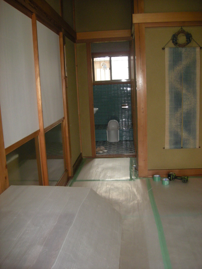 最初に玄関からトイレまでに、いつもの様に養生をします!!