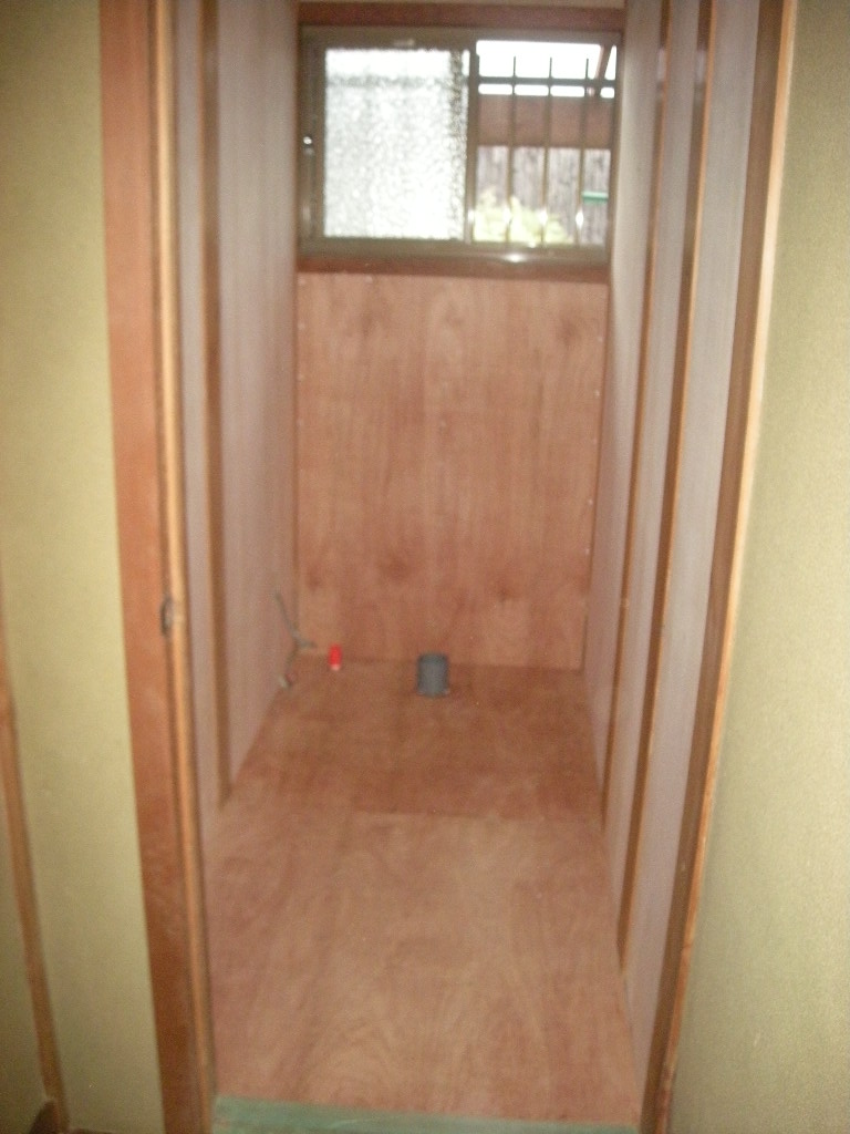 ご覧の非水洗トイレ(俗に言うポットン便所)を全面解体し、天井と壁廻りはクロス仕上げに