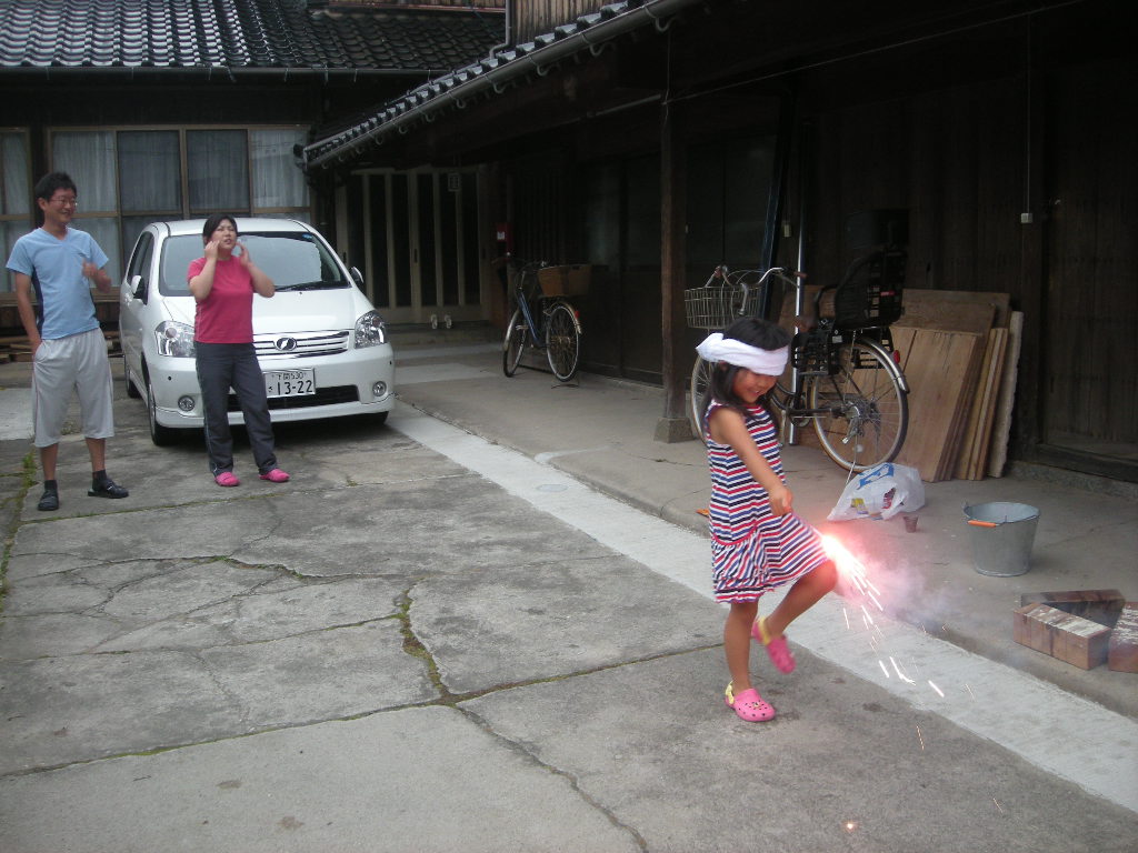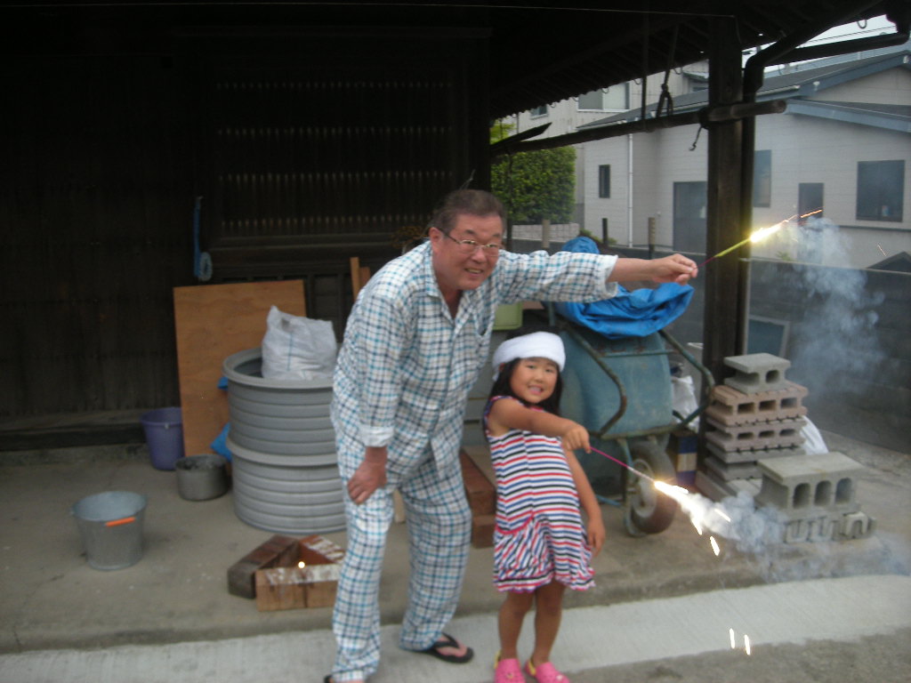7/5(土)の夕方、まだ日が落ちないうちに孫の明ちゃんと花火遊びをしました。