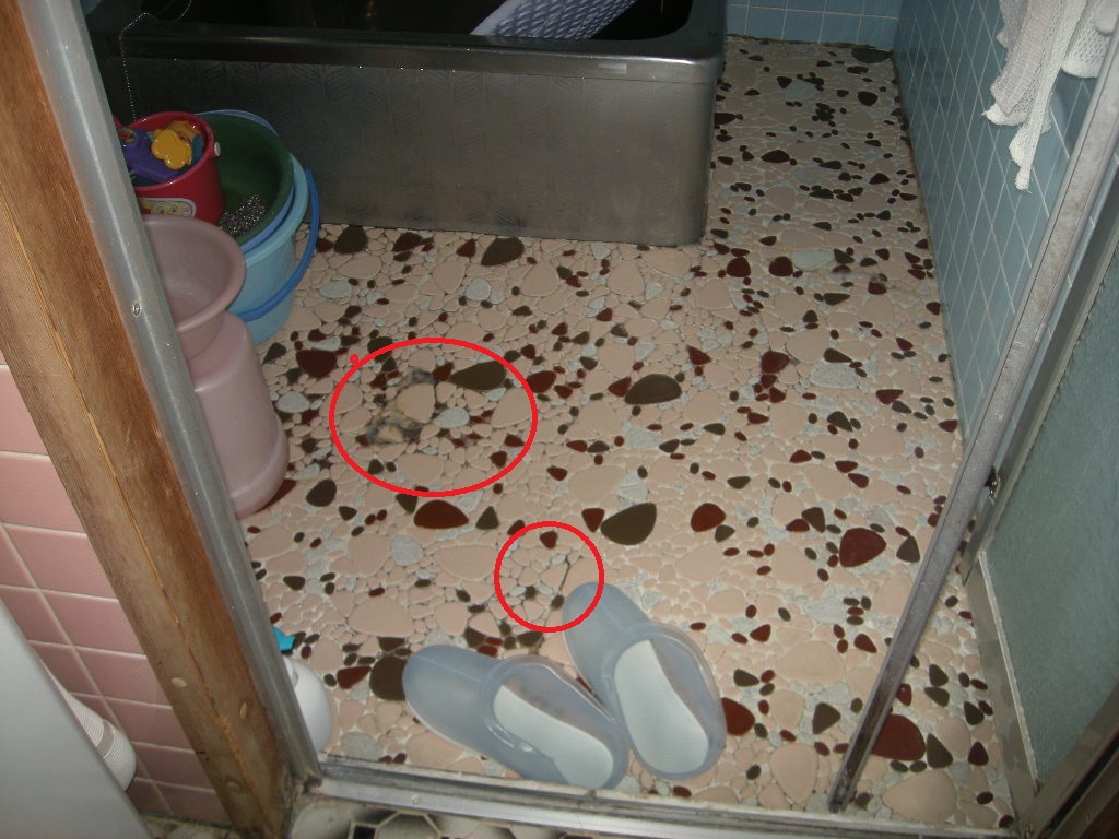洗い場の土間タイルも亀裂(赤線で囲った部分)が入り水が下に染み込む様な状態です!!