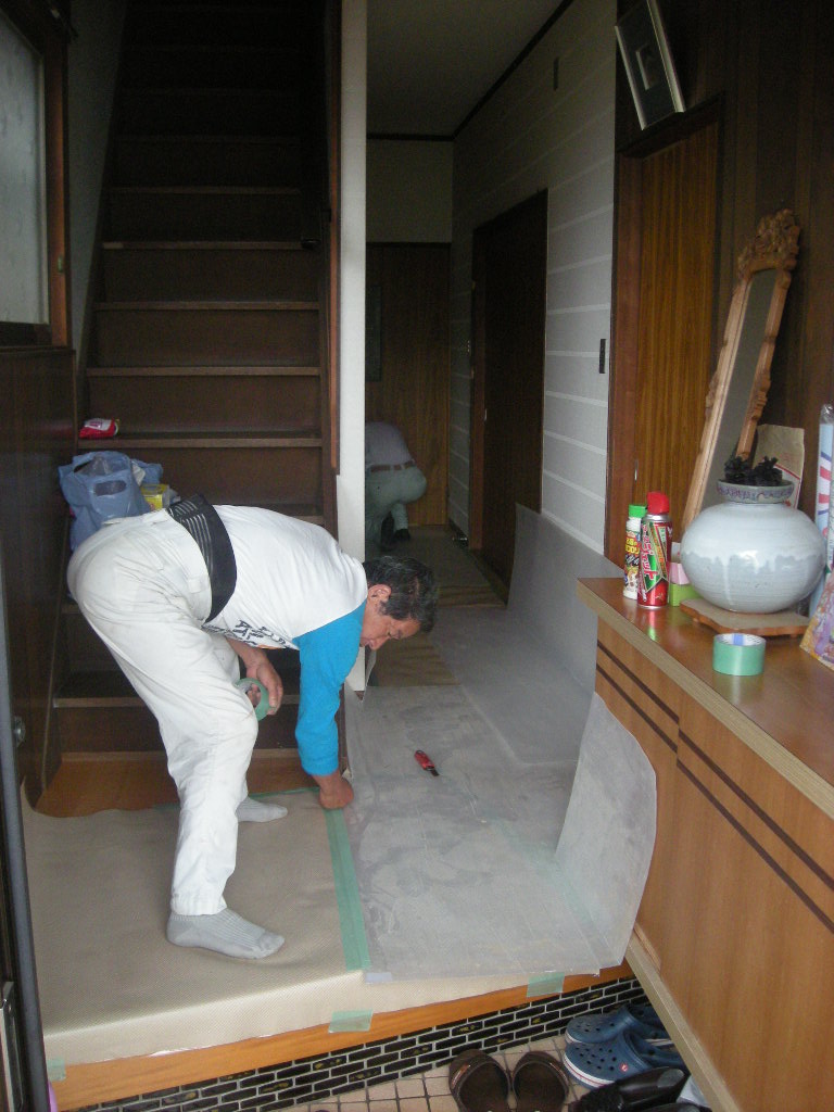 最初に玄関から浴室までの廊下に養生をします!!