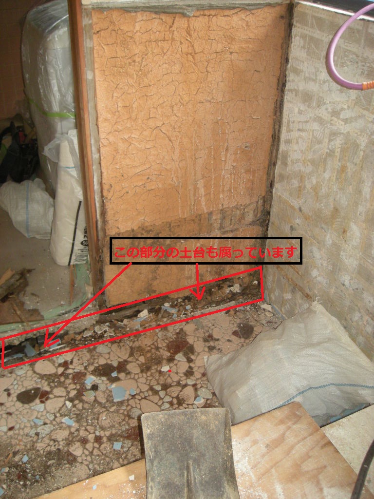 *洗い場のタイルに亀裂が入っていたので、そこから水が染み込み土台廻りに