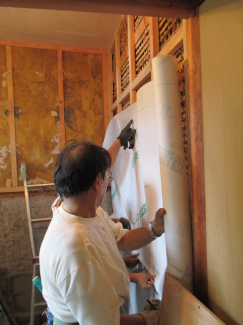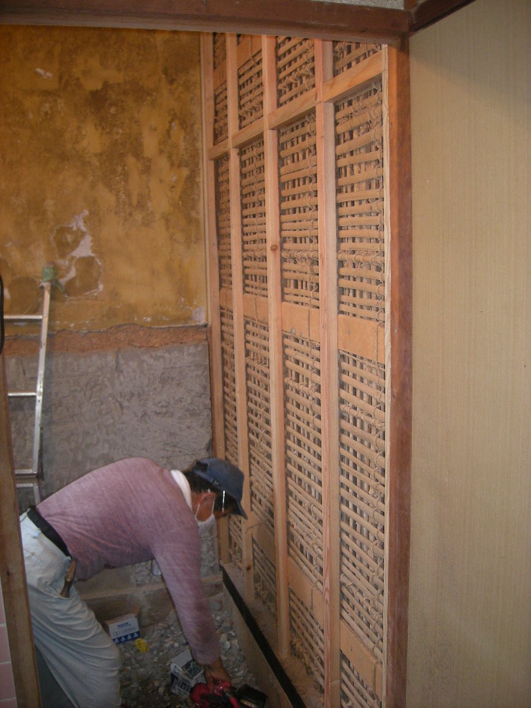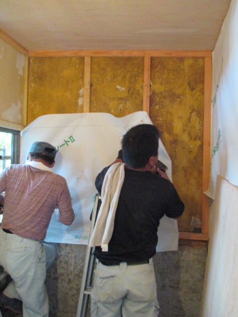壁廻りに防水コンパネを張る下地づくりをします(タル木や胴ブチで骨組みをします)!!