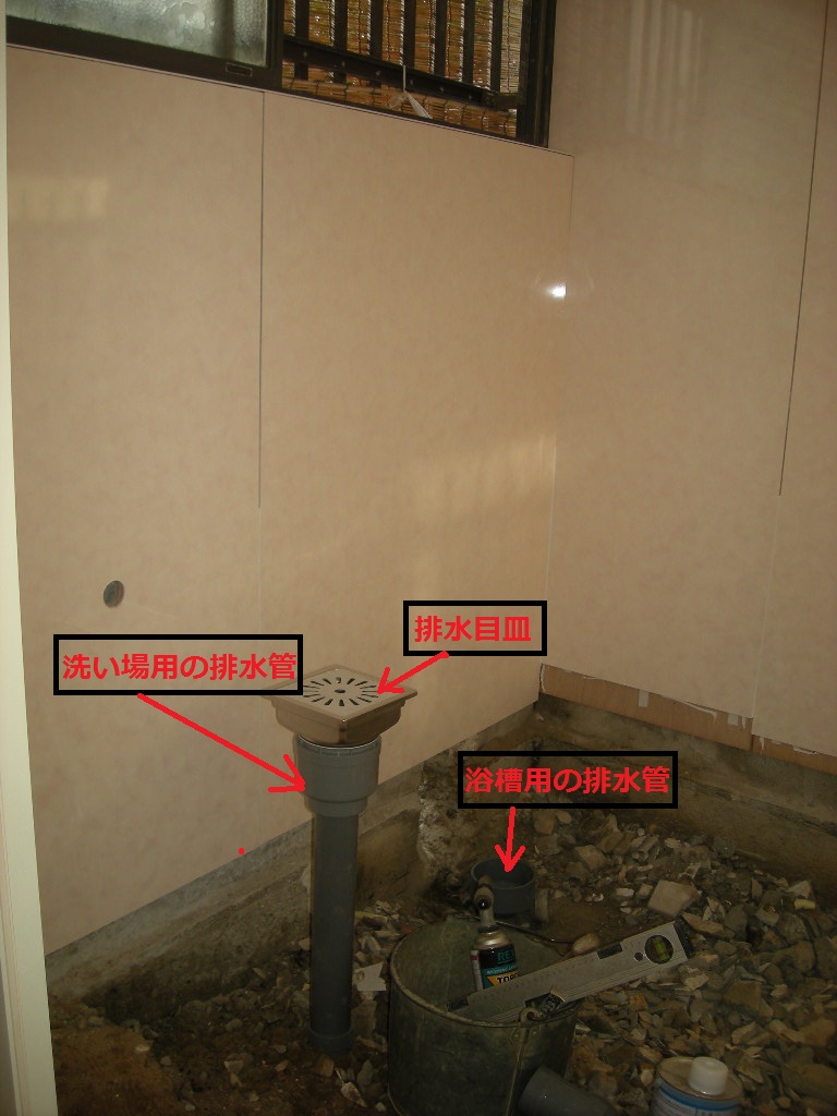 設備屋さんによる、浴槽と洗い場の排水管の移設・整備工事も完了です。