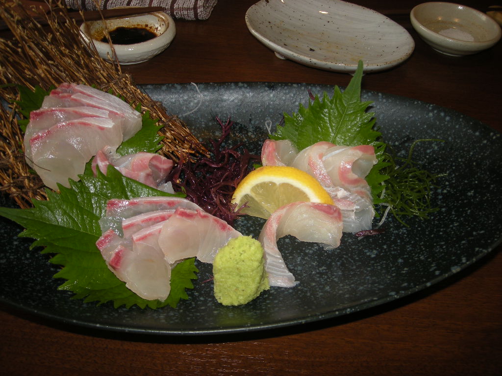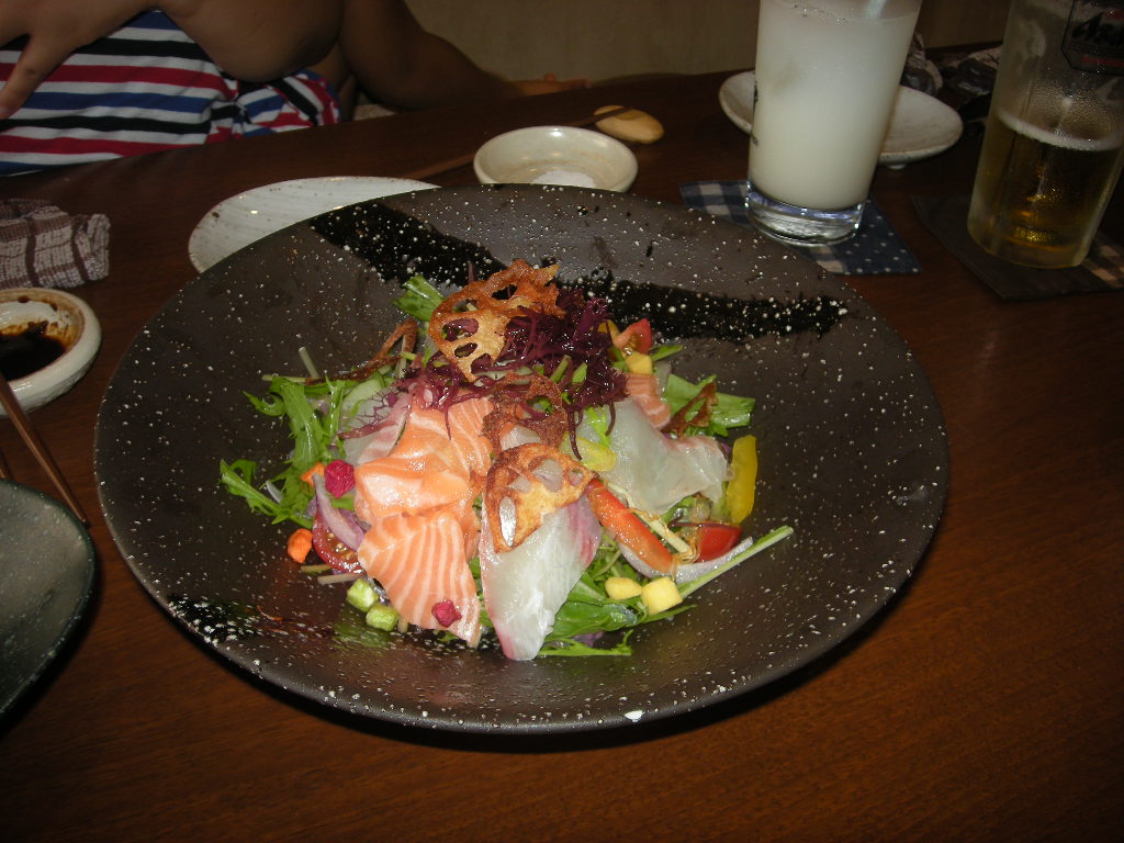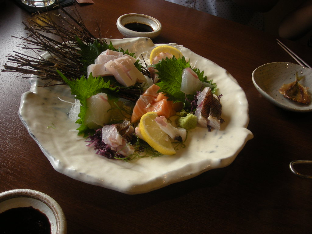 最初に「さしみの盛り合わせ」です(カンパチ、タイ、サーモン、タコ等々)!!