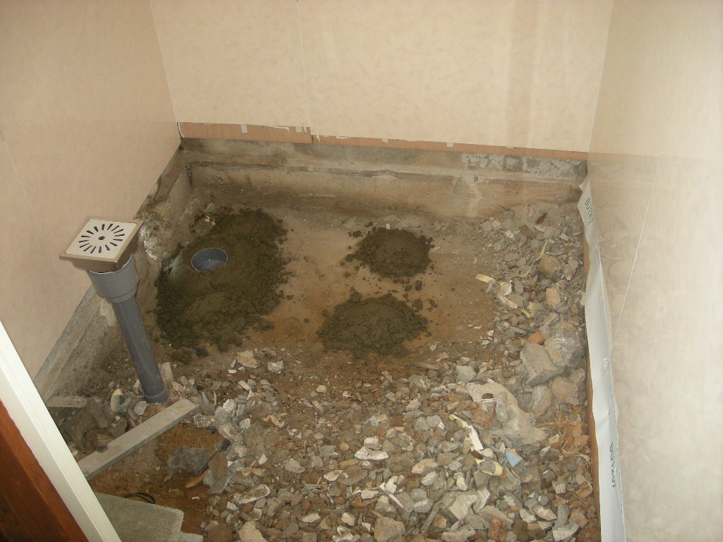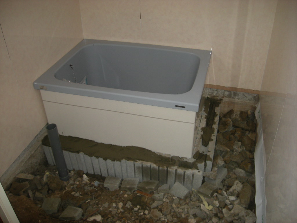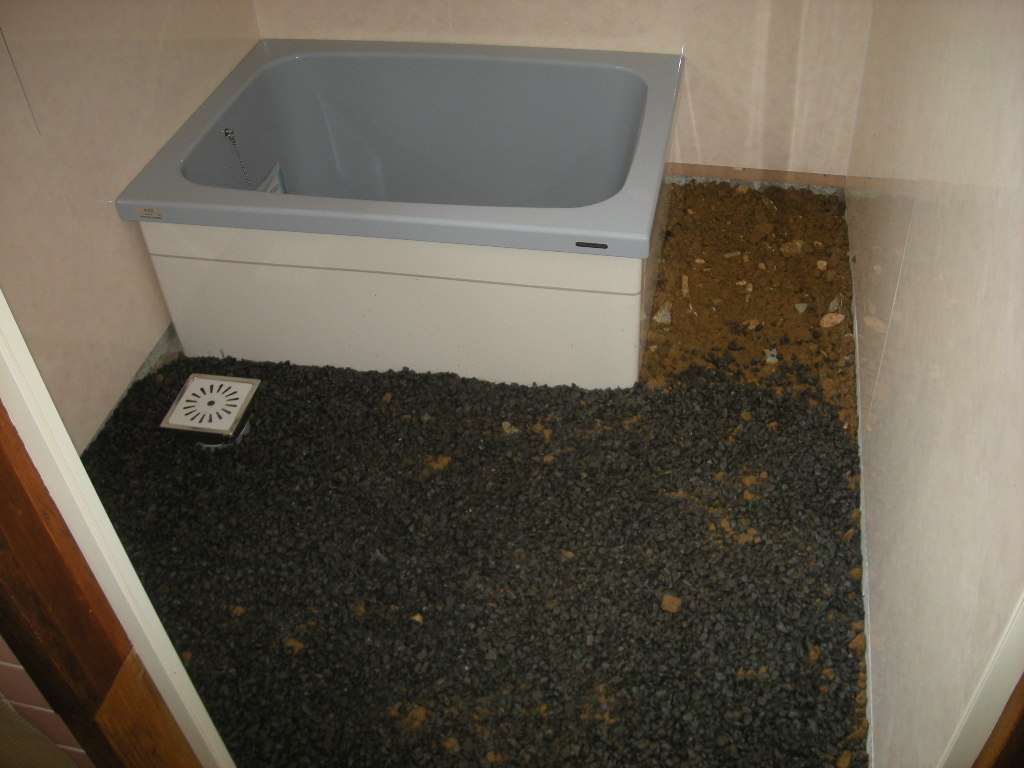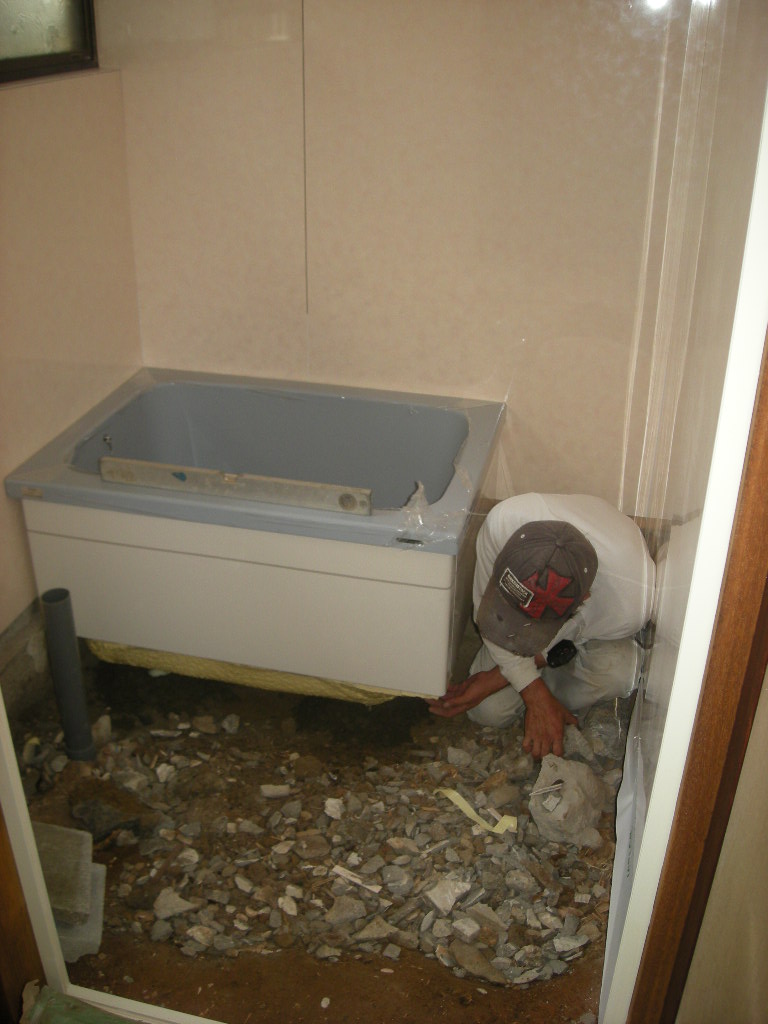 浴槽を据え付ける前に、浴槽の足の乗る部分にモルタルを施工し、排水管廻りにも