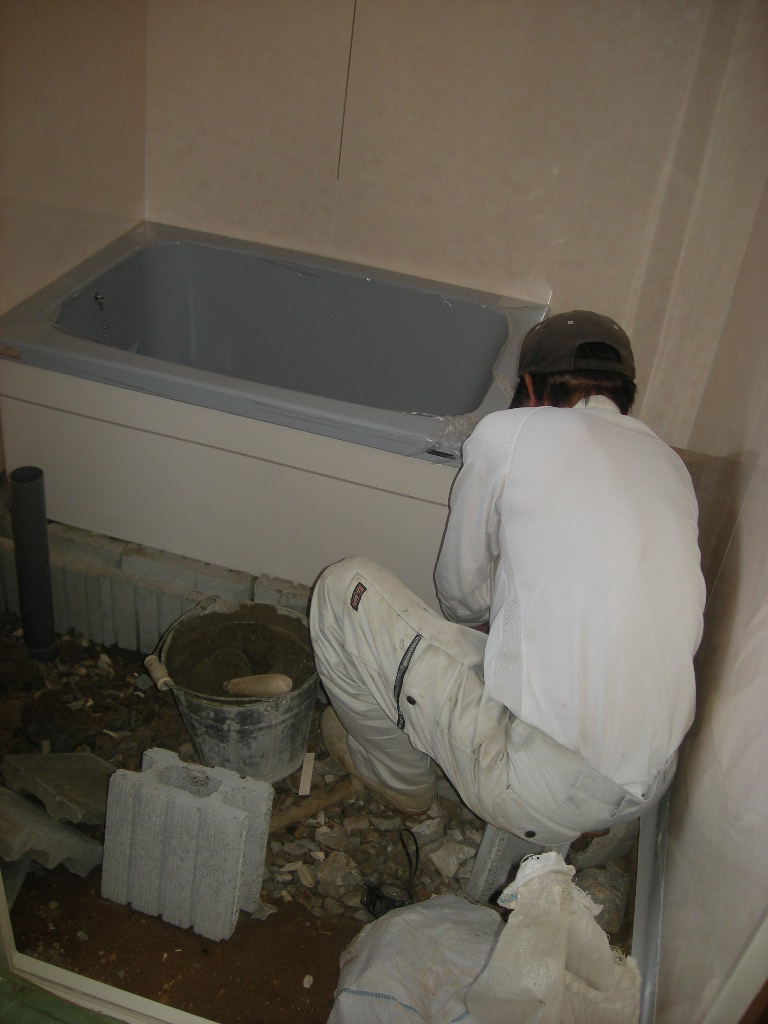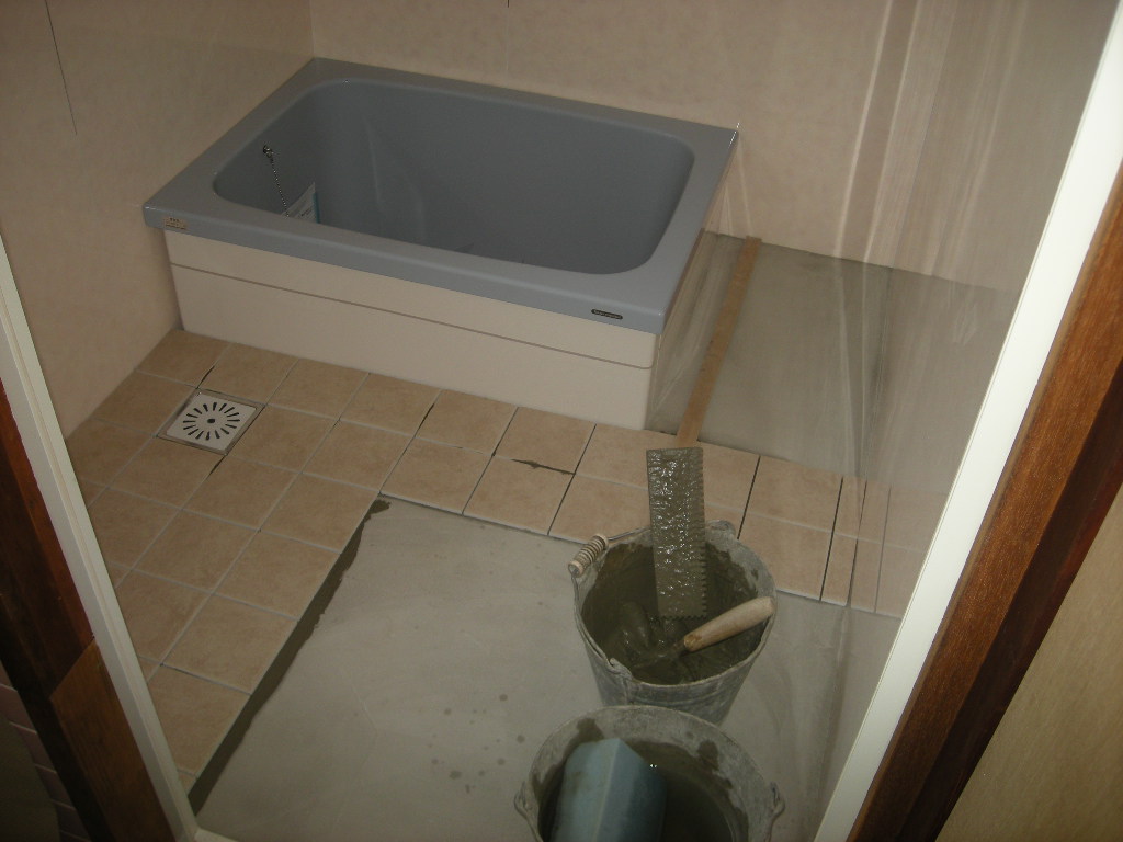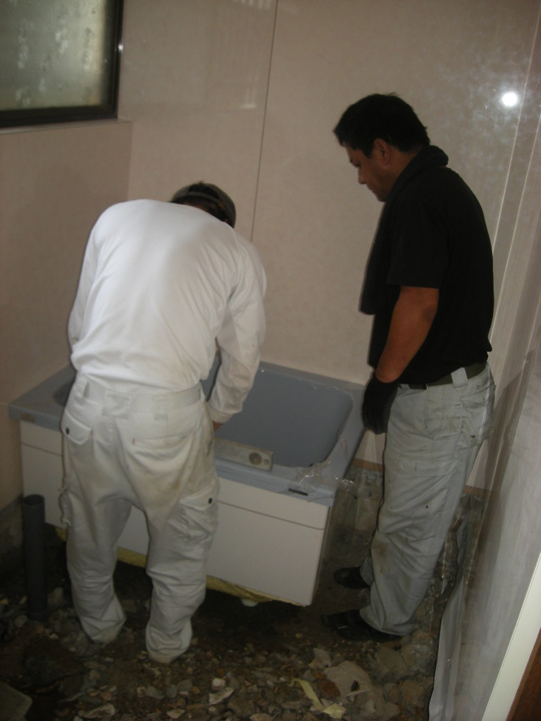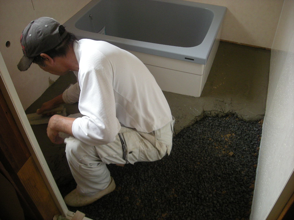 浴槽の据付けから、洗い場のタイル張りまでの左官さんの作業の様子を紹介します。