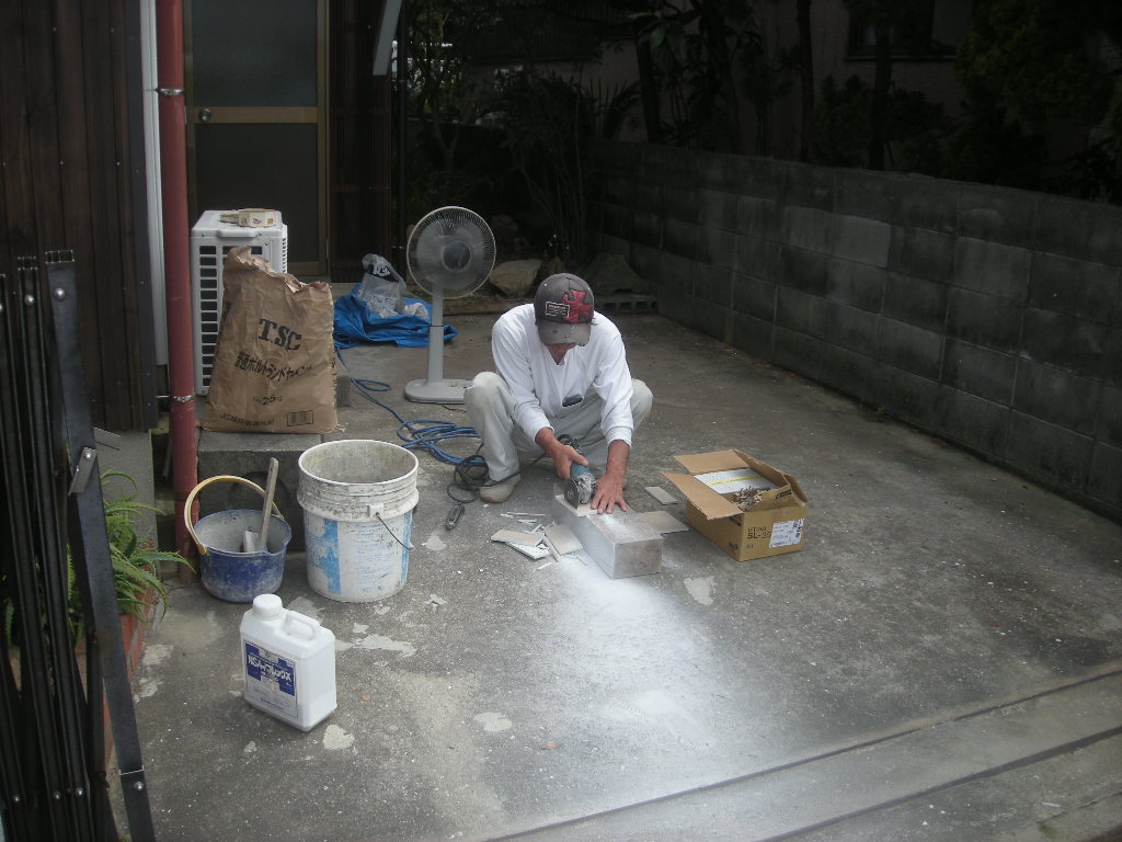 外でタイルを加工します!!