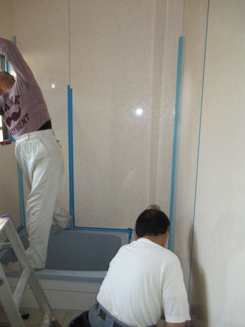 パネル目地や浴槽廻りにコーキングを打つ前に養生テープを張って行きます!!